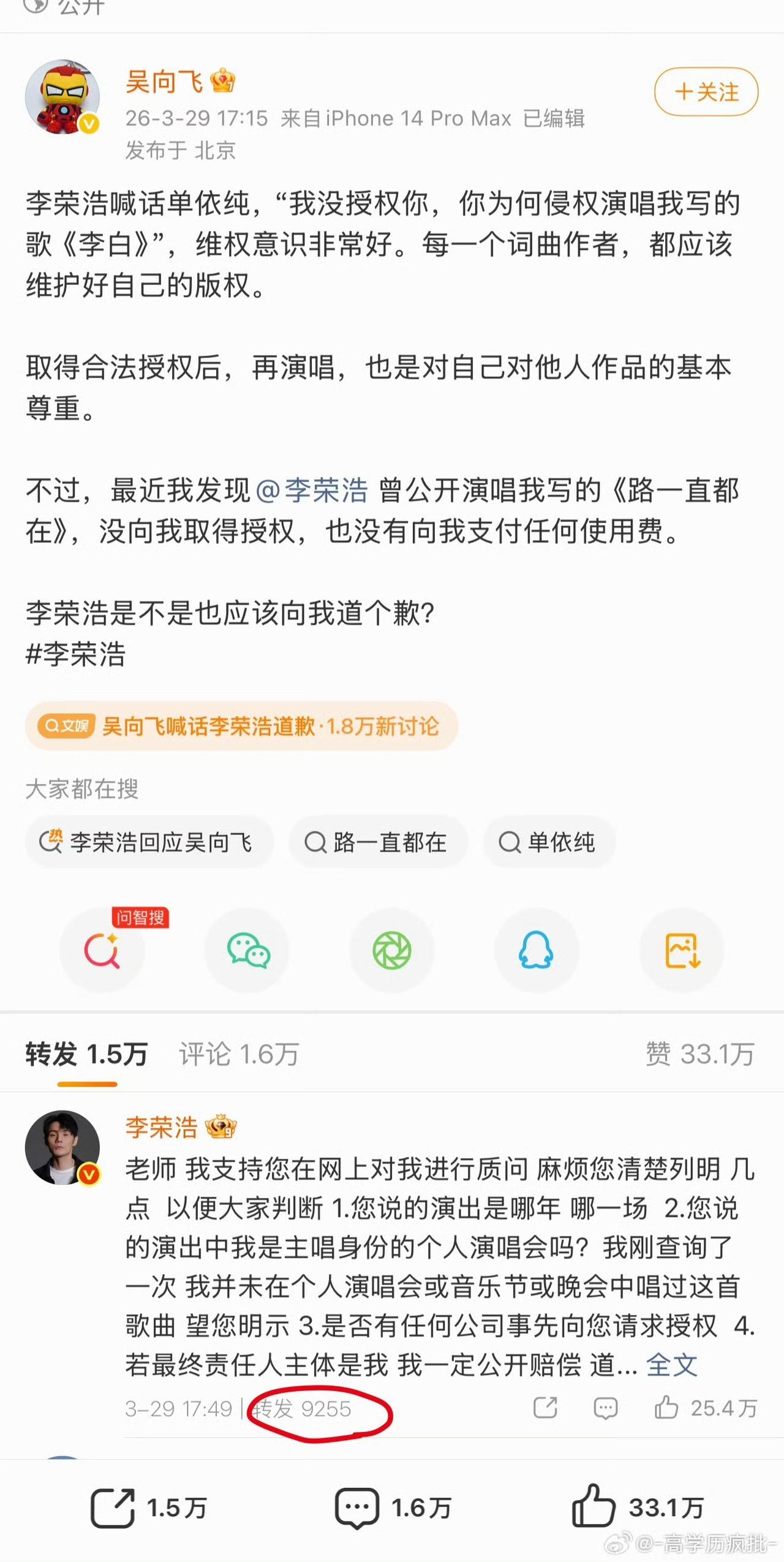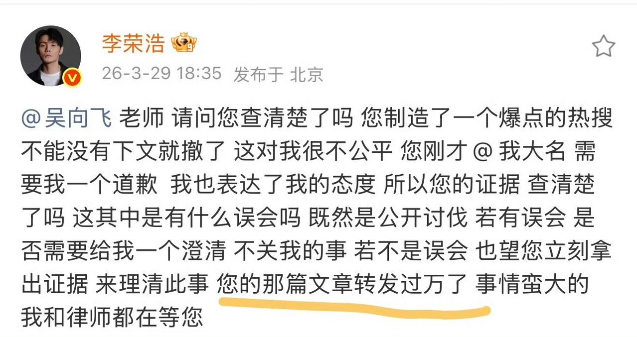 不得不说李荣浩这波操作真的太精明了!早前放话只要网传言论转发破万,就直接走法律途径维权。谁料真实数据压根不达标,八千多的转发量大半还是他自己主动引流带起来的。他亲自下场以身入局,冷静拿捏舆论节奏,一边戳破数据水分,一边坚守版权底线博弈,心思通透又步步为营,属实把人心和舆论玩明白了。