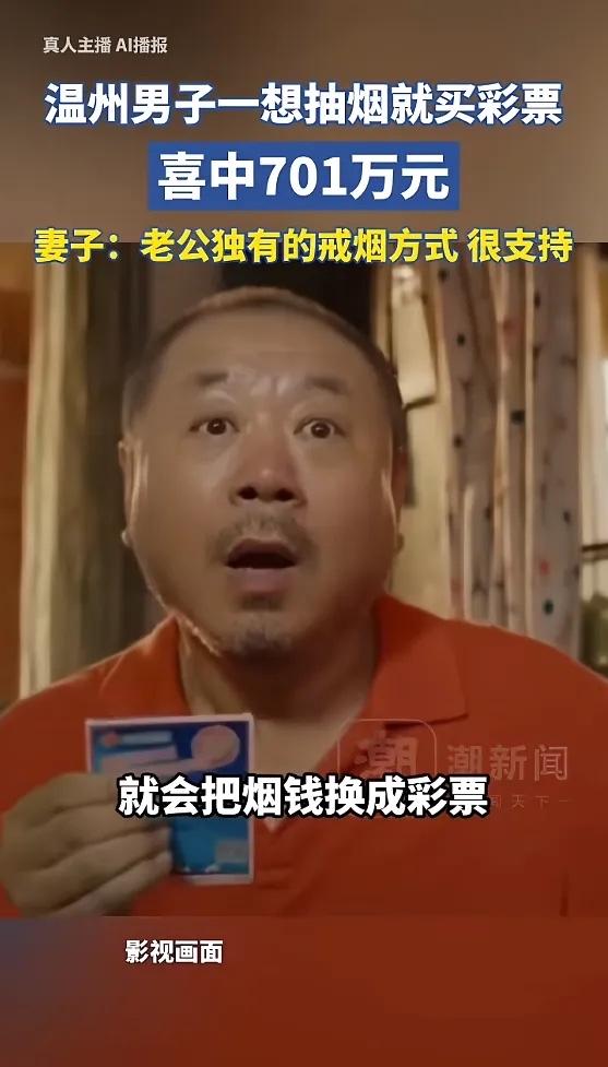 “简直赚翻了!”浙江温州,一男子为了戒烟,想出了一个办法,就是每次想抽烟时,就把烟钱拿去买彩票,本来只是想戒烟成功,没想到最后中了701万元大奖!本来妻子就很支持男子这种戒烟方式,现在更收获了意外之喜!网友:这运气绝了! 中奖的曾先生是个老彩民了,烟瘾有十几年了,想戒,难受。有一天他琢磨,把买烟的钱换个地方花,是不是能好受点?买彩票吧,花的不多,还能有个念想,这个念头改变了一切。 从那天起,想抽烟的冲动一上来,他就告诉自己忍住,这钱能买张彩票。有时候是十块,有时候二十,这笔烟钱变成了一张张的体育彩票。妻子黄女士觉得这法子好,至少让丈夫戒烟了。 3月16日那天,体彩大乐透第26027期开奖。曾先生像往常一样,把看好的号码告诉妻子,让她顺路去彩票店打出来。一张12元的复式票,前区五个号,后区两个号。谁也没想到,就是这张妻子亲手买回的彩票,击中了当期全国唯一的一注一等奖,奖金整整701万元。 三天后,夫妻俩一起出现在浙江省体彩中心。领奖的时候,曾先生一个劲儿地感谢妻子。他说,买彩票这么多年,老婆从来没反对过。这次中奖的票还是她帮忙买的,这份幸运,有一大半是妻子的功劳。黄女士在旁边听着,有点不好意思地笑了。她说,买彩票是丈夫的戒烟方式,能保护身体,心里还存着份小希望,当然要支持。 面对从天而降的巨款,两口子显得特别清醒。他们说,买彩票本来就是日常的小娱乐,这笔钱会好好规划,用来改善家庭生活,但绝不会因为有钱就昏了头。“我们都这个年纪了,懂得珍惜,不会乱花。”这话实在。 这个故事最打动人的,其实不是中奖的运气。而是一个丈夫为了健康做出的积极改变,和一位妻子无条件的理解与支持。那份相濡以沫的感情,比701万更珍贵。戒烟是好事,买彩票中了奖是惊喜。但比惊喜更难得的,是身边有人愿意陪你,用充满希望的方式,把日子一点点过好。 各位读者你们怎么看?欢迎在评论区讨论。