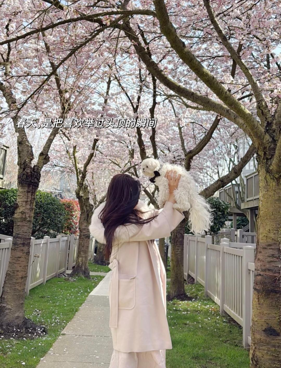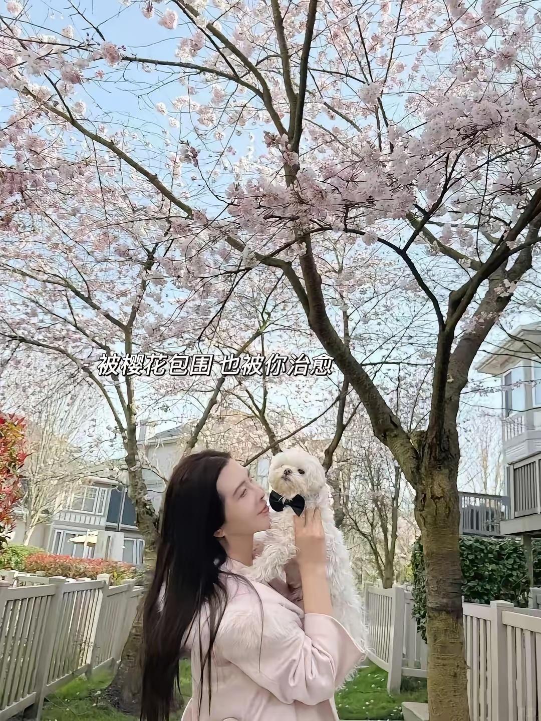 春樱烂漫时,王祖贤一袭粉裙,乌发垂肩,与爱犬共赏花枝。背影温柔中带着疏离,仙气依