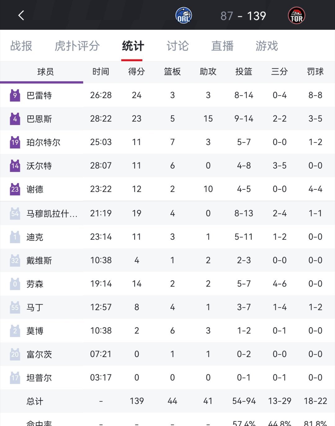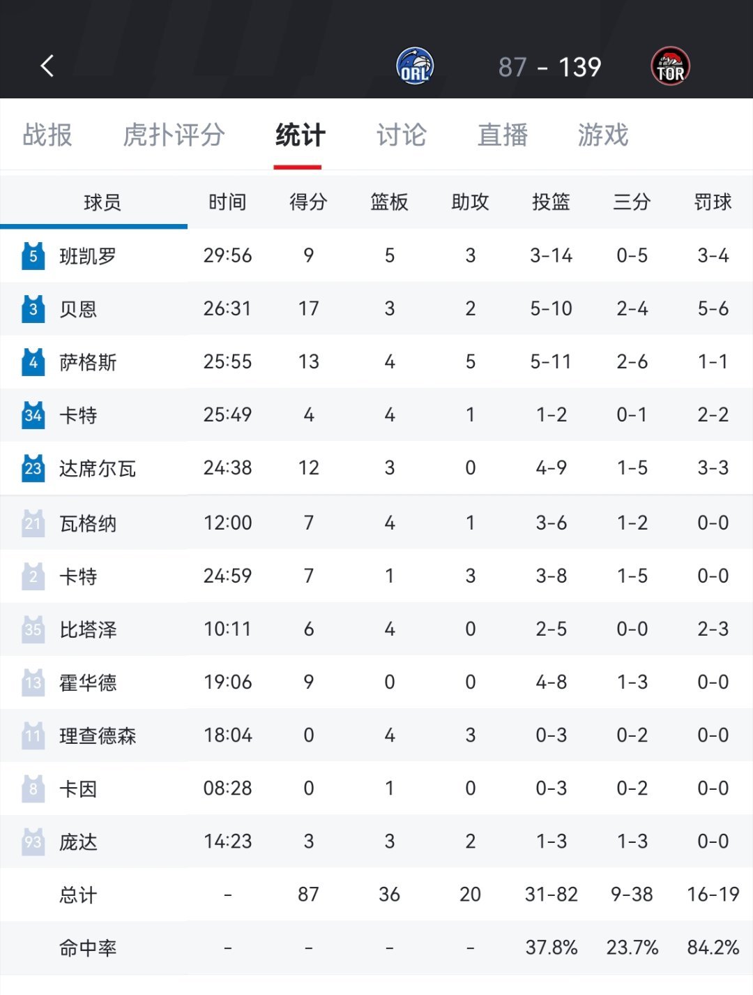 魔术87-139惨败猛龙!魔术命中率仅37.8%,班凯罗14中3仅得9分并有5次