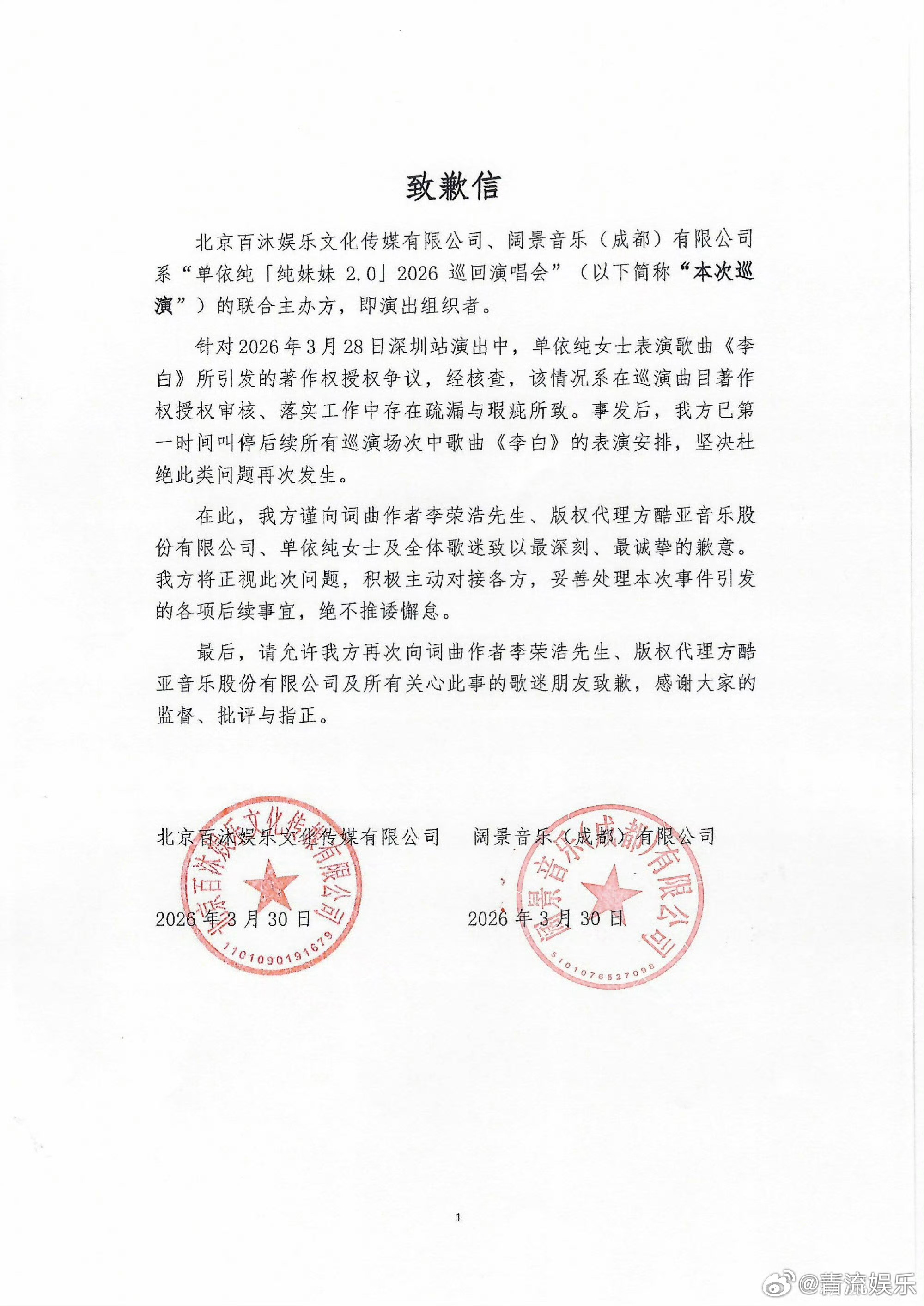 单依纯公司致歉信单依纯公司回应 30日凌晨,单依纯、李荣浩相继回应后,单依纯公司也发致歉信,称单依纯表演歌曲《李白》所引发的著作权授权争议,经核查,该情况系在巡演曲目著作权授权审核、落实工作中存在疏漏与瑕疵所致。事发后,已第一时间叫停。