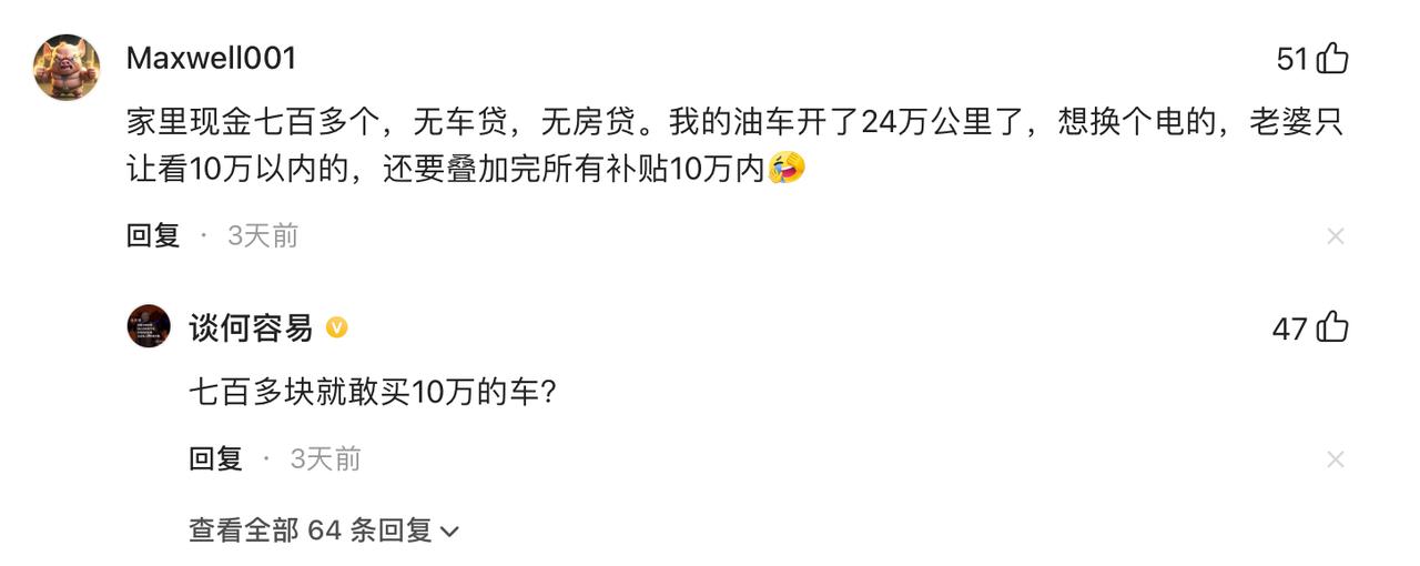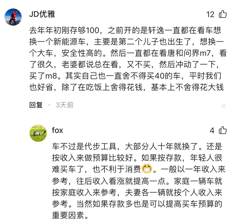 上周我发了条不同存款的购车心理的帖子(),好多朋友交流了他们的故事,读起来很真实让人启发,挺好,你有没有一些买车故事可以分享[呲牙]