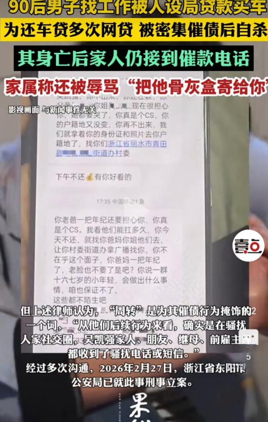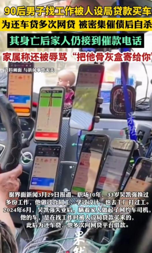 浙江东阳,33岁的男子,在母亲长眠的公墓旁,在车里结束了生命。而悲剧的开始,以为能找到月入过万的司机工作,不料,却掉进了“贷款买车”的陷阱,最终男子被无休止的催债,逼上了绝路。最让人难以接受的是,男子死后,家人还接到催收电话,被辱骂:“把他骨灰盒寄给你”。 深秋的浙江东阳,城郊公墓的风带着刺骨的凉,吹过一排排沉默的墓碑。 一辆普通轿车孤零零地停在一座墓碑旁,车窗紧闭,33岁的吴凯强就在车里结束了自己的生命,身旁是他母亲的长眠之地,这是他绝望中唯一的慰藉。 33岁的男子,在母亲长眠的公墓旁,在车里结束了生命。 而悲剧的开始,以为能找到月入过万的司机工作,不料,却掉进了“贷款买车”的陷阱,最终男子被无休止的催债,逼上了绝路。 一条鲜活的生命,就这样被不法分子的贪婪和冷漠碾碎。 吴凯强是个普通到不能再普通的底层打工人,一辈子最大的心愿,就是靠双手让家人过上安稳日子。 他没读过多少书,也没有过人技能,踏入社会十年,辗转于合同工、设计、工厂流水线等底层岗位,辛苦奔波却只能勉强糊口。 家里有年迈的父亲要赡养,刚上小学的继女要照顾,母亲的离世,更给这个艰难的家庭蒙上了阴影。 2024年夏天,吴凯强再次失业,家里的困境让他整夜难眠。 他每天抱着手机刷招聘平台,不放过任何挣钱机会,就在近乎绝望时,一条高薪司机招聘信息闯入视线:保底月薪1.2万,公司配车无押金,全程不用操心。 急于挣钱的他没有多想,立刻拨通招聘者电话,满心憧憬着尽快入职。 招聘者态度热情,电话里不停安抚,说工作门槛低、只要面谈就能入职,还反复承诺不会让人失望。 吴凯强被热情冲昏头脑,第二天瞒着家人独自前往面谈,殊不知一场精心设计的骗局正等着他。 面谈时,招聘者绝口不提司机岗位的具体内容、薪资发放方式,全程拉着他看车,不停催促签订购车合同。 急于找工作的吴凯强被催得晕头转向,没仔细看条款就稀里糊涂签了字、按了手印。 拿到合同冷静后,吴凯强彻底懵了——自己名下莫名多了一辆十几万的车,还背上了高额贷款:要么19万分60期,月供3194元;要么高达30多万,利息惊人,远超他的承受范围。 他这才明白,高薪工作只是诱骗他贷款买车的幌子。 吴凯强想找招聘者理论、退车取消贷款,可对方早已不见踪影。 合同已签、贷款到账,他被牢牢套住,不敢告诉家人真相,只能谎称被调至丽水分公司,独自租了间连卫生间门都没有的简陋小屋,默默承受一切。 为还车贷,吴凯强只能自己注册网约车平台接顺风车单。 他每天天不亮就出门,穿梭在城市街巷,不管刮风下雨都不敢休息,直到深夜才拖着疲惫回到小屋。 可顺风车收入极不稳定,运气好时月入4000多,差时不足1000,大多时候连车贷都不够。 眼看车贷要逾期,吴凯强走投无路,先后在5个网贷平台借款10几万,本想暂时缓解压力,却陷入更深的深渊。 网贷利息滚雪球般增长,短短几个月债务翻倍,他连利息都无力偿还,无休止的催收电话和短信随之而来,彻底摧毁了他的精神防线。 催收电话不分昼夜,不仅轰炸他本人,还打给家人、朋友、前雇主甚至继母和继女,散播他欠钱不还的消息。 催收手段恶劣,用支付宝转0.01元挑衅,还扬言上门骚扰、去户籍地村委会广播,让他颜面尽失,家人也受牵连。 长期的债务压力和精神折磨,让吴凯强彻底绝望。 他每天活在恐惧中,担心家人受伤害,夜里失眠、日渐消瘦,看不到任何希望。 2025年10月19日,网贷逾期第一天,催收施压更疯狂,他彻底崩溃了。 那天,吴凯强在浏览器搜索80多条“死亡方式”,买了农药后开车到母亲公墓旁,给QQ邮箱发了遗书,字里行间满是愧疚和无助,说自己不想死,却怕催收伤害家人,只能选择结束痛苦。 随后,他喝下农药、割腕自杀,当天还接到4通催债电话,成为压垮他的最后一根稻草。 为给吴凯强讨回公道,家人找了律师再次报案。 起初因证据不足未立案,律师多次沟通并提交遗书后,事情迎来转机。 2026年2月27日,东阳市公安局正式刑事立案,调查背后的套路贷团伙和暴力催收人员,誓要还逝者公道。 如果各位看官老爷们已经选择阅读了此文,麻烦您点一下关注,既方便您进行讨论和分享,又能给带来不一样的参与感,感谢各位看官老爷们的支持!