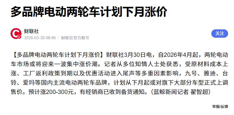 消息称九号等电动车即将涨价。据媒体报道,受原材料上涨、优惠活动到期等因素的影响,九号、雅迪等知名两轮电动车品牌,正计划从下月起对在售车型进行价格调整。 记者表示,目前除预计涨幅在200-300元外,已有经销商已收到备货通知。
