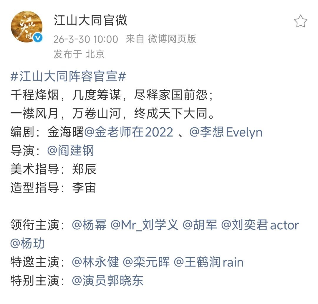 杨幂江山大同一番江山大同番位杨幂 大同官宣了,杨幂一番,紧接着刘学义胡军、刘奕君
