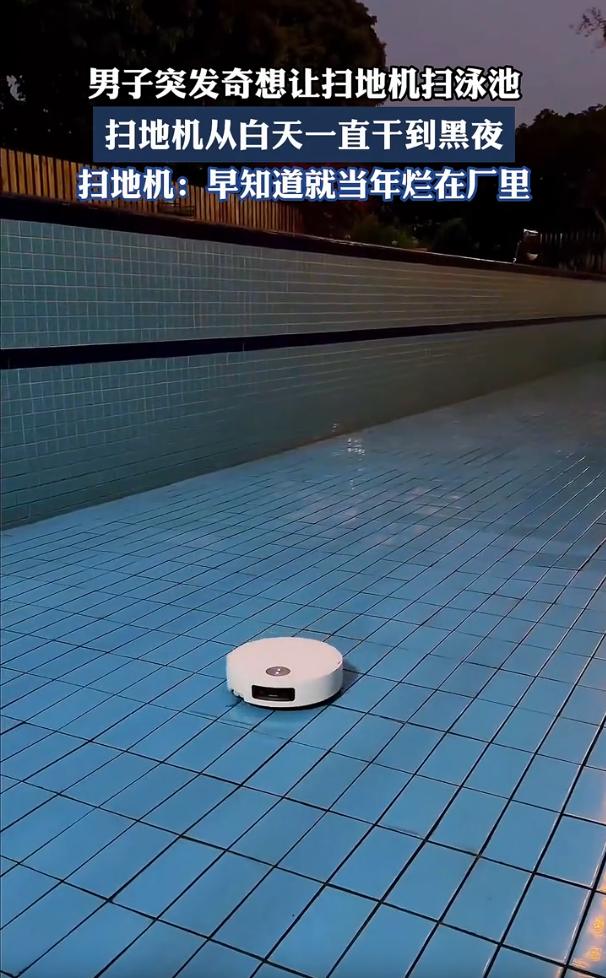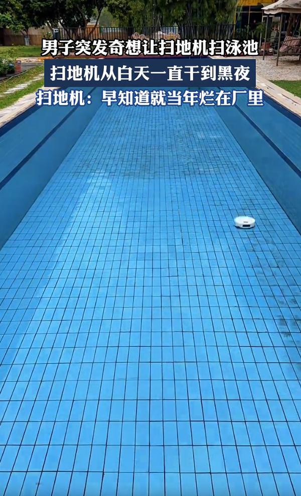 广东,男子想要在自家泳池洗澡,但过了一个冬天水池实在太脏,于是突发奇想,用扫地机器人进行清扫,直接从白天干到了黑天,网友:我活了快40年,第一次从内心深处同情一个机器 天气转暖后,男子想着家里那几十米长的泳池终于能派上用场了。可打开一看,泳池的底部全都是黑泥,看着就让人打退堂鼓。自己动手刷?腰受不了。请人来洗?又觉得不值当。他低头看了眼正在客厅转悠的扫地机器人,一个大胆的想法诞生了 男子直接把扫地机器人拎起来,往泳池里一放。机器被丢进这个“巨型待清洁区”,懵没懵不知道,反正开工是立马开工了。几十米长的池底,它就那么一趟一趟,规规矩矩地来回蹭。从日头高照,一直干到天黑愣是没歇气。你还别说,最后真把整个池底擦得锃亮 但看着泳池前后对比图,有网友表示:第一次从一个机器身上看到了疲惫和无奈 说起来也挺有趣,小机器在空旷的池底来回折返的样子,莫名有种西西弗斯推石头的孤独感。它不知道池子有多大,也不知道自己为什么要干这活,只是按照程序设定,一遍遍跑完属于自己的路线,没电了就回去充电,抹布脏了就自动回洗 不过话说回来,这也能看出科技改变生活 以前买扫地机器人,那是正儿八经当个家电,指望它替自己省点弯腰的力气。现在呢?不少人把它当成一个万能清洁工,擦完地还得擦窗,擦完窗还得擦车,擦完车现在连泳池都不放过。几百上千块的东西,硬是被开发出了十八般武艺