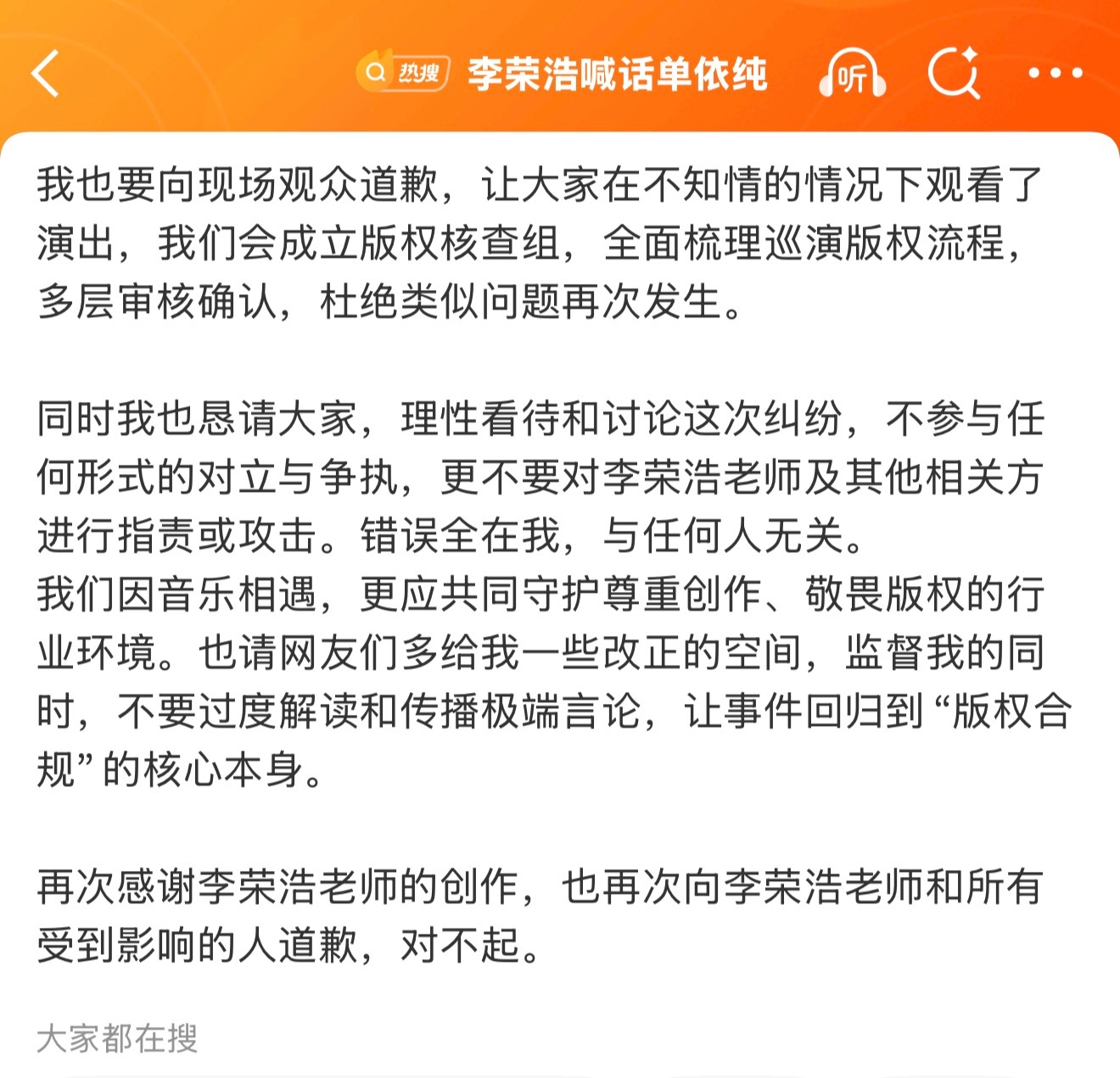 单依纯发文给李荣浩道歉了大概就是自己没看演唱会开始之前的授权文件是外包的责任,自己什么也不知道。