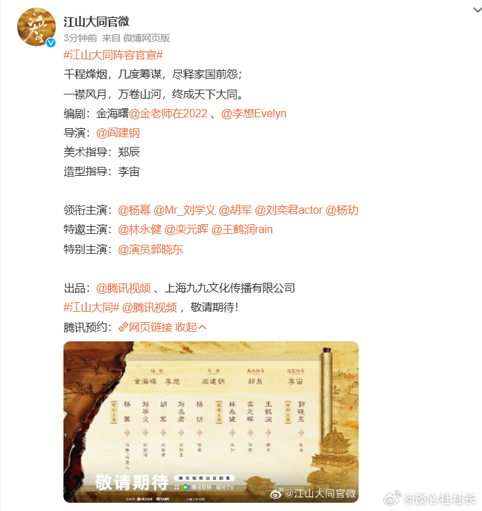 杨幂《江山大同》阵容官宣,有网友发现:江山大同在腾讯视频的简介疑似遭”魔改”,和