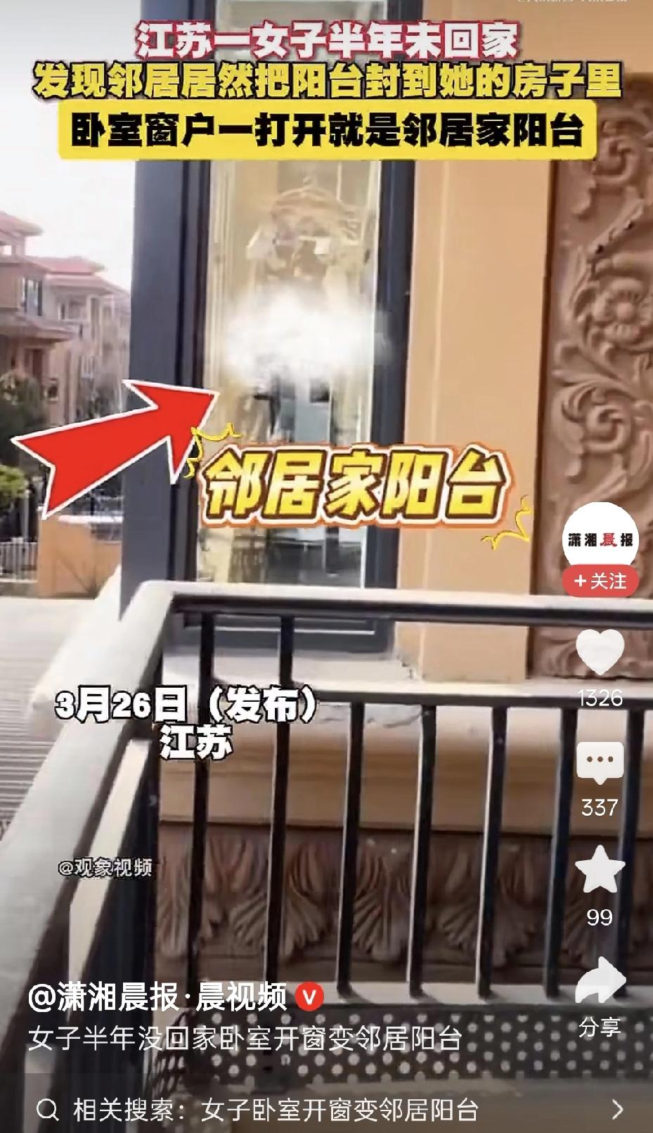 太霸道了!江苏一位女子,出差半年刚回到家,推开窗户的瞬间直接吓懵了,自家的阳台居然被邻居硬生生圈占了,里面不仅放了一台洗衣机,还特意安装了洗手台,各种杂物堆得满满当当,女子站在原地愣了好久,怎么也不敢相信,这明明是自己花钱买的地盘,邻居怎么敢这么大胆,连招呼都不打一声就擅自占用。 女子这套房子买了有三四年了,当初买的时候就是看中了这个阳台的采光和空间,想着以后装修完,既能晾晒衣物,也能摆个小茶桌,闲暇时晒晒太阳。 女子缓过神后,第一时间走到对门敲响了邻居家门。 开门的是一位中年住户,面对女子的质问,对方没有丝毫愧疚,反而表现得十分坦然。 在邻居看来,女子长期不在家,阳台一直空置着,自己只是合理利用闲置空间。 女子听到这样的说法,心里满是气愤和不解。 她清楚记得购房时的合同条款,阳台属于房屋套内专有面积,是自己出资购买的私有空间。 并非小区公共区域,也不是邻居可以随意支配的地方。 她转身回家翻出房产证和购房合同,上面清晰标注了阳台的产权归属。 拿着这些凭证再次找到邻居时,对方依旧没有改变态度。 甚至觉得女子太过较真,一点邻里情面都不讲。 这样的相处逻辑,让女子彻底认清了对方的自私心态。 自己的房产即便暂时没有装修使用,也不代表他人可以擅自改造占用。 这种不打招呼、先斩后奏的做法,已经突破了基本的处事底线。 在城市小区的居住环境里,这类空间侵占的纠纷并不少见。 不少住户会混淆私有面积与公摊面积的界限,把他人闲置空间当作可利用的公共区域。 久而久之,便形成了随意占用、无视他人权益的不良习惯。 从法律层面来看,我国民法典对业主的专有部分所有权有着明确规定。 业主对自己住宅内的专有部分,享有完全的占有、使用和处置权利。 任何个人不得擅自侵占、改造或损坏他人的专有物业部分。 邻居私自改造女子阳台,摆放家电、搭建洗漱区域的行为,已经构成侵权。 按照相关法律规定,侵权方需要及时停止侵害,将空间恢复至原有状态。 如果造成了实际损失,还需要承担对应的赔偿责任。 女子随后联系了小区物业,希望物业能出面协调解决问题。 物业工作人员赶到现场后,确认了阳台属于女子私有产权,明确要求邻居清理物品。 但物业仅具备协调职能,没有强制执法的权力,邻居依旧拒不配合整改。 多次口头沟通都没有结果,女子的耐心也被逐渐消耗殆尽。 她开始正式咨询专业律师,了解通过司法途径维权的具体流程。 她不想把邻里关系闹僵,但也绝不会纵容他人随意侵占自己的合法财产。 很多邻里矛盾的根源,都在于一方缺乏基本的边界意识。 有人觉得远亲不如近邻,就可以随意干涉或使用对方的物品与空间。 却忘了尊重他人私有财产,是人际交往中最基础的原则。 城市住宅的空间划分本就十分清晰,专有部分和公共区域的界定十分明确。 住户可以合理使用公摊区域,但绝不能把手伸向他人的私有空间。 哪怕只是暂时占用,也需要提前征得产权人的同意。 女子当初购置这套房产,投入了不少积蓄和心血。 她看中阳台的采光与视野,对未来的居住生活有着具体的规划。 半年的出差本是工作所需,没想到回家后会遭遇这样的无理侵占。 长期外出的业主,很容易遇到类似的房屋空间被侵占的情况。 部分人会抓住房屋空置的时机,擅自占用阳台、楼道等空间。 这也提醒着长期在外的住户,要做好房屋的日常看管工作。 可以委托亲友定期上门查看房屋状态,也可以和物业建立常态化沟通。 发现异常情况时,能第一时间介入处理,避免侵权行为持续发生。 维护自身财产权益,从来都不是小题大做的行为。 邻里之间的和睦相处,建立在互相尊重、互不侵犯的基础上。 一方的自私和越界,只会破坏原本平和的居住环境。 即便最初只是小事,也可能慢慢演变成难以化解的长期矛盾。 面对明确的侵权行为,妥协和忍让换不来真正的邻里和睦。 坚守自身的合法权益,用合理的方式解决问题,才是正确的处理方式。 法律的存在,就是为了保障每个公民的私有财产不受侵犯。 女子的遭遇也给所有小区住户提了一个醒。 无论关系亲疏,涉及私有财产的处置,都不能抱有侥幸心理。 提前沟通、尊重边界,才是维系良好邻里关系的核心。 各位读者你们怎么看?欢迎在评论区讨论。