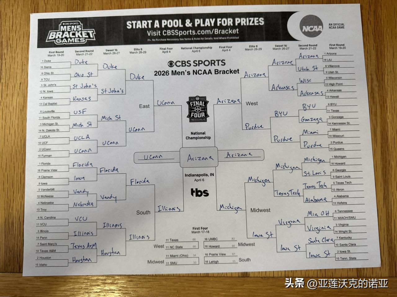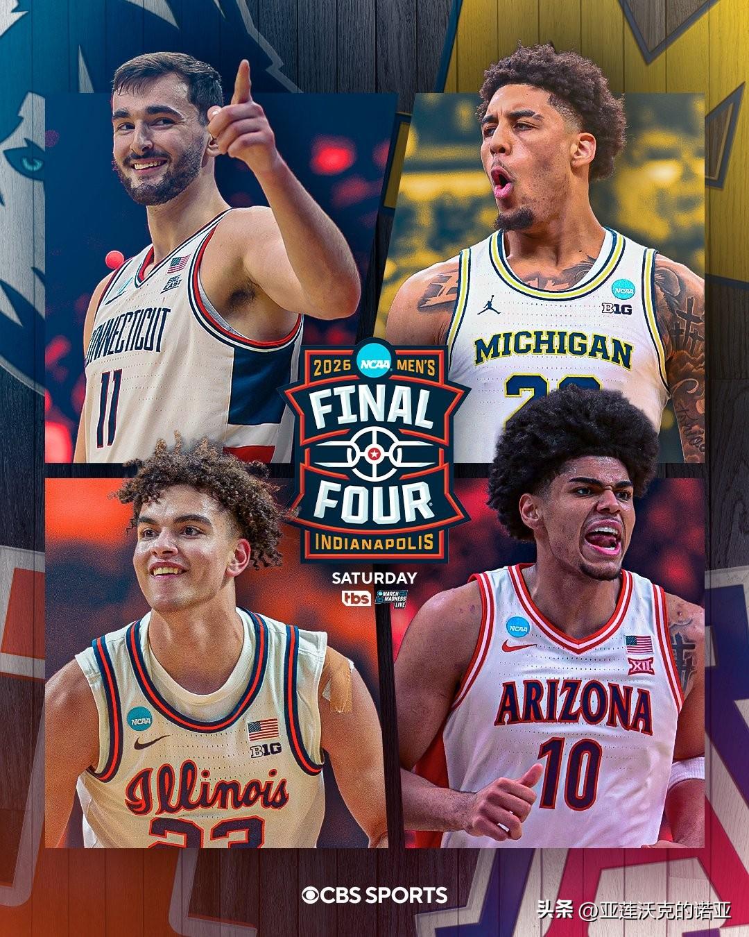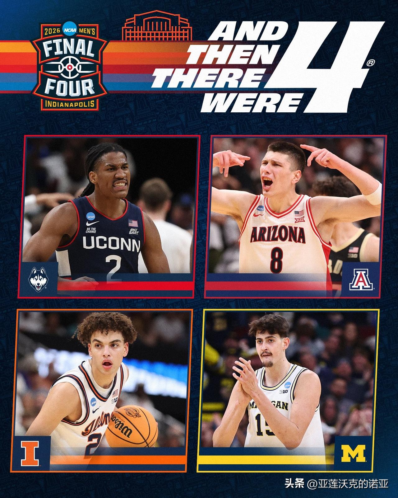 最终四强出炉,康涅狄格vs伊利诺伊,亚利桑那vs密歇根大学,NCAA男篮 247官网球探Adam Finkelstein预测中了四强,他看好亚利桑那大学夺冠,2026年nba选秀 野猫自2001年以来首次晋级最终四强,将前往印第安纳波利斯,那里正是球队在1997年夺得队史唯一一次全国冠军的福地。