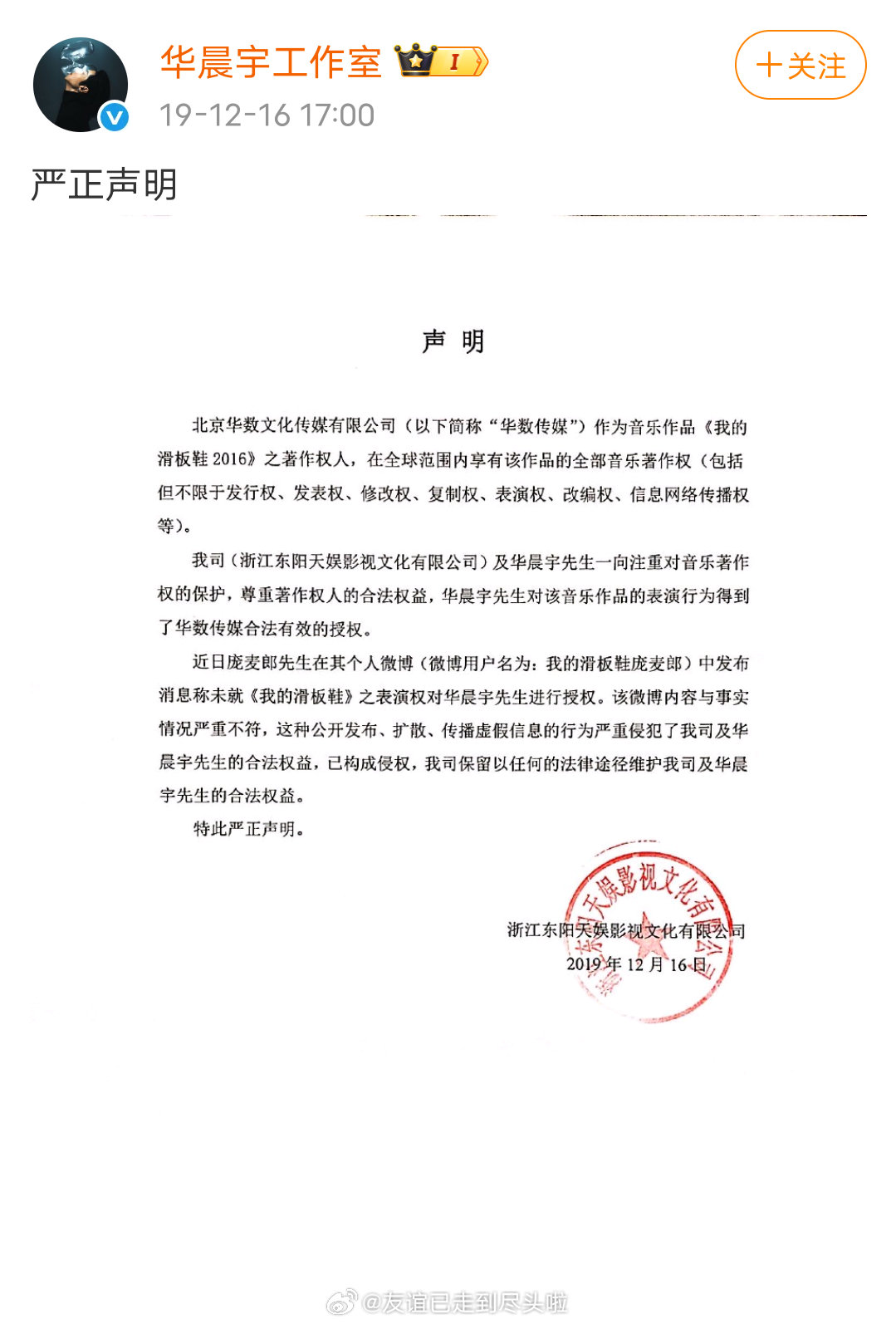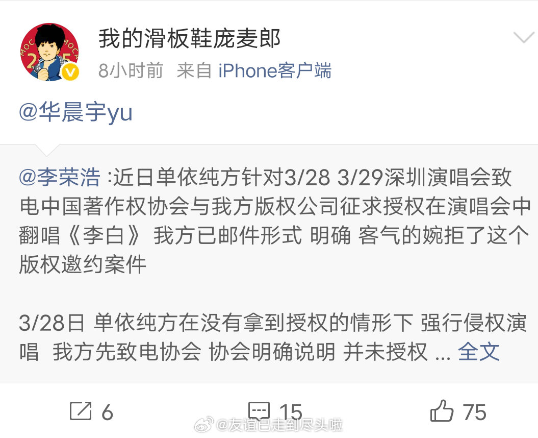 庞麦郎转发了李荣浩的维权博,并艾特了华晨宇。华晨宇工作室早在19年就晒出了滑板鞋的版权购买声明,华晨宇的表演得到合法有效授权。庞麦郎和原公司的版权纠纷,不该迁怒其他人,这个时候站出来。。。