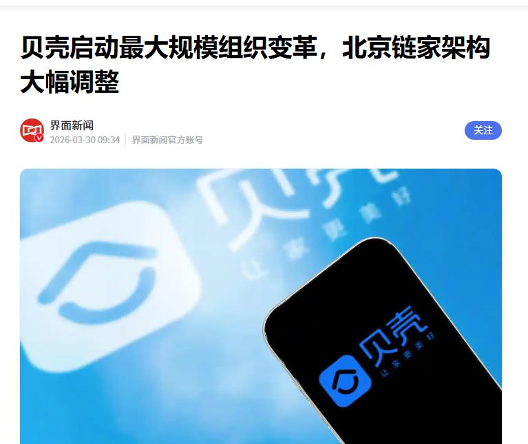 曝贝壳启动最大规模组织变革 据媒体报道,近日贝壳董事长兼CEO彭永东发布《贝壳的下一个阶段:以消费者为中心,重建组织》全员信,宣布公司将从“交易平台”转型为“社区居住服务平台”。 在这样的背景下,贝壳内部除集团事务线以及城市组织架构进行了重大调整外,其还成立了集团变革委员会以及五大专项管理委员会。