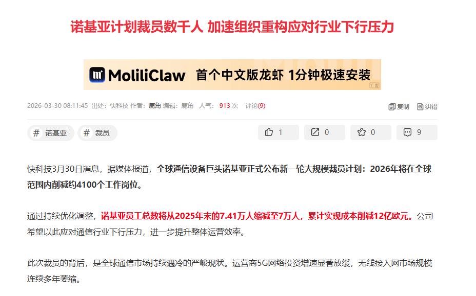 为抵抗行业压力,诺基亚或裁员数千人 据了解,近日网传消息指出诺基亚或将裁员数千人,以便节省开支、提升运营效率,进而应对全球通信行业的下行压力。 具体而言,诺基亚准备削减4100个工作岗位,并关闭慕尼黑研发基地。将自身的核心资源从传统的移动网络业务逐渐转移到云计算、企业解决方案等领域,以此摆脱对传统业务的过度依赖。