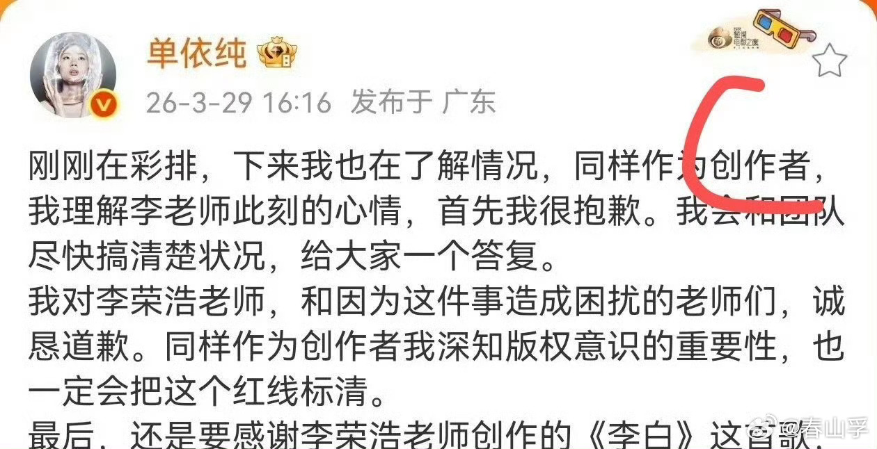 单依纯音著协登记作品为0版权这事儿其实很简单:别人不同意就是不能唱。一边没原创作品登记,一边谈版权立场,难怪大家议论纷纷,还是要对原创多一点敬畏心啊~李荣浩说不需要赔偿