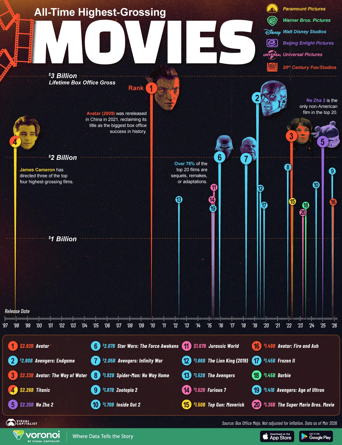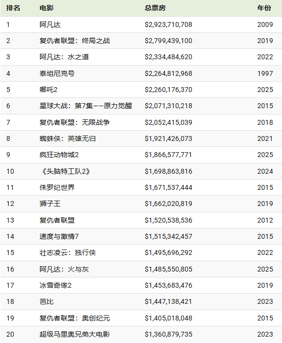 票房超过20亿美元的只有7部。《阿凡达》29.2亿美元,《复仇者联盟4:终局之战》 28亿美元,《阿凡达:水之道》23.3亿美元、《泰坦尼克号》和《哪吒2》均为22.6亿美元、《星球大战:原力觉醒》 20.7亿美元,《复仇者联盟:无限战争》20.5亿美元。