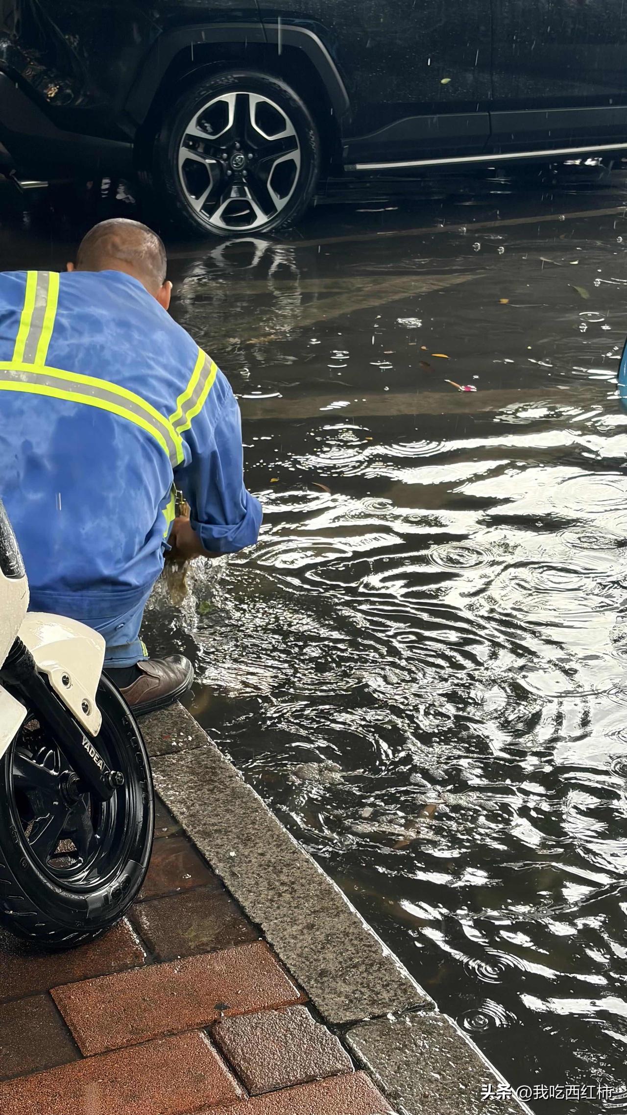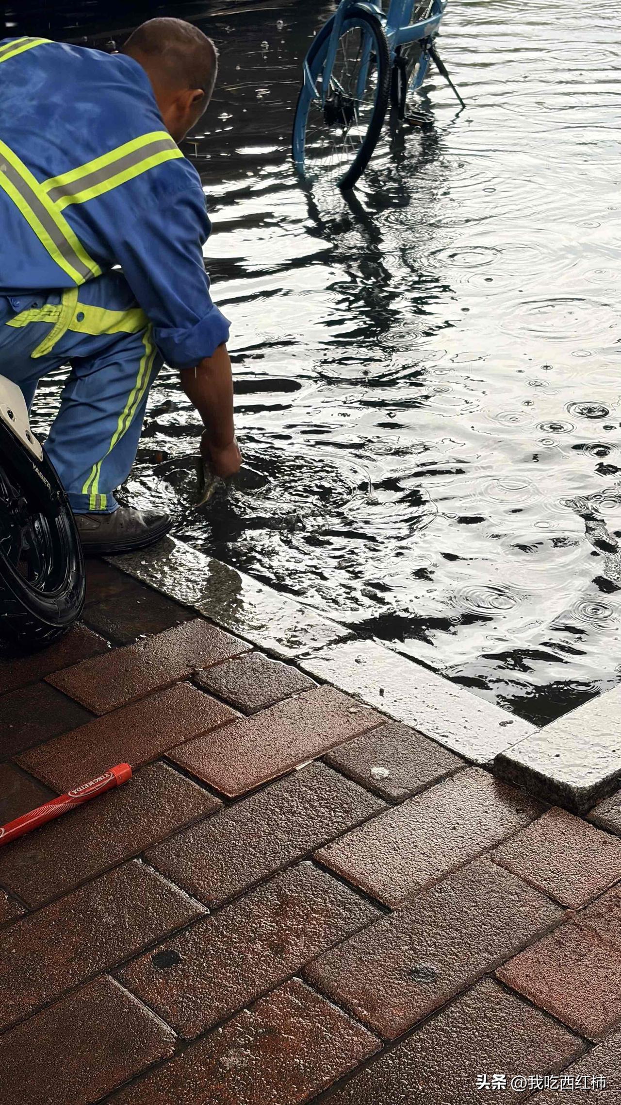 广州暴雨实拍|被环卫工师傅这一幕狠狠破防 看着暴雨积水里,环卫工人师傅弯腰徒手疏通排水口的背影 画面里雨水砸在水面上的涟漪、淹没半轮的共享单车,还有师傅专注的动作,都带着一种“风雨中坚守”的真实力量。 一位环卫工师傅就这么蹲在积水里,徒手掏排水口的杂物,一遍又一遍,任由雨水砸在背上,只为了让积水能快点排走,让大家能顺利回家。 真的瞬间破防了🥹 我们总在说要去山野、去露营、去看远方的风景,却常常忽略了,在我们奔赴热爱的同时,有这样一群人,在暴雨里、在烈日下,默默守护着我们的城市,守护着每一个普通人的日常。 广州的雨很大,但这座城市的温度,永远比雨更暖。 向每一位风雨里坚守的城市守护者,说一声:辛苦了🙏