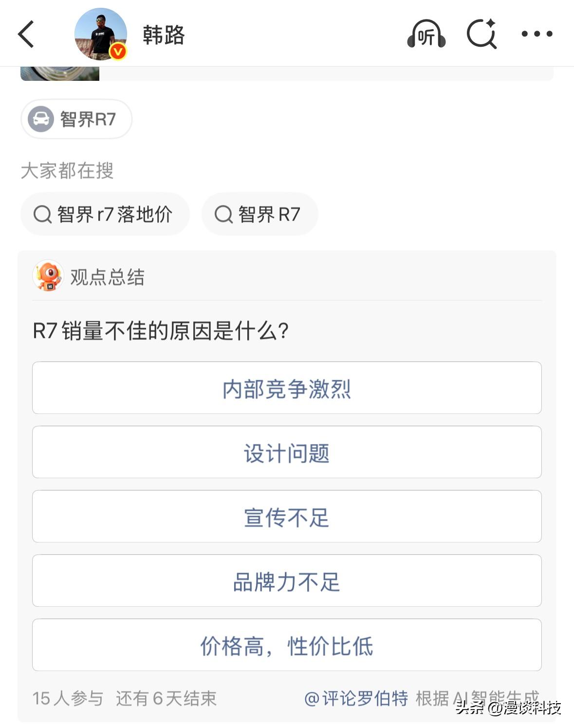 韩路称智界R7被低估了,乘坐空间极大、后备箱极大、储物极强、智驾也强、外观流畅。 其实,作为奇瑞和华为合作的车型,智界R7按理说应该不愁卖的,但近期销量不太令人满意。按理说作为华为系比较六边形能力的车,操控、续航、装载、智驾都没毛病,甚至可以说比较突出,我觉得应该销量不比特斯拉Model Y差的。