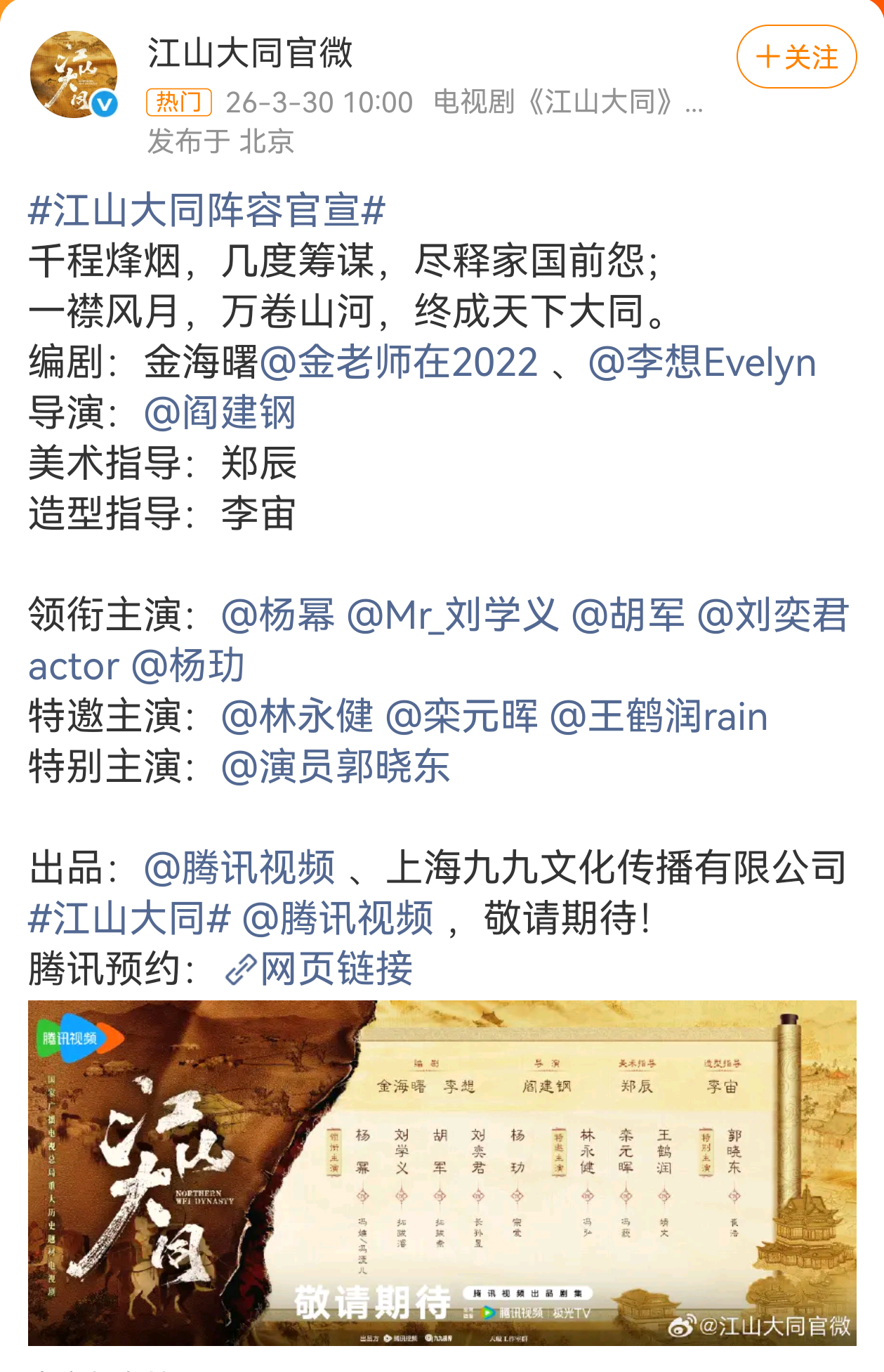 江山大同阵容官宣 期待历史正剧出身的国民女演员杨幂! 杨幂江山大同出发进组