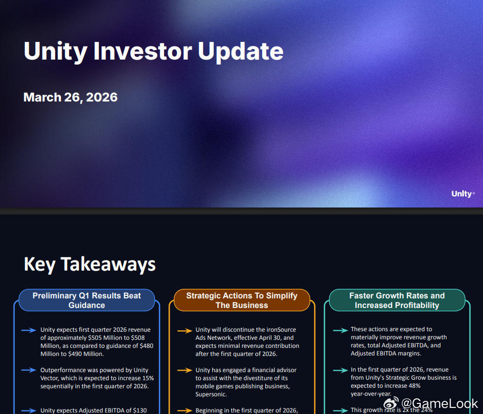 【Unity再收缩:要出售手游子公司Supersonic、关闭Ironsource广告网络网页链接】北京时间3月27日,外媒mobilegamer称Unity即将卖掉旗下休闲游戏发行品牌Supersonic,并计划关掉Ironsource广告网络。当日发布的一份投资者更新报告证实,Ironsource广告网络将于4月30日起停止运营。