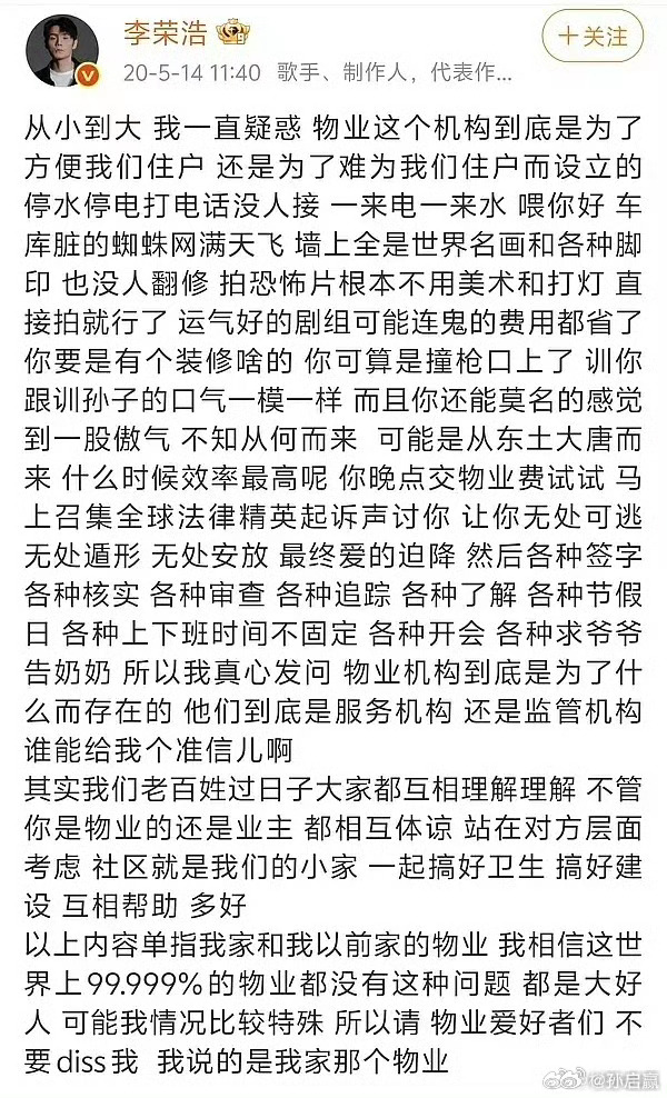 李荣浩骂物业 传世经典不得不说李确实是搞艺术的,文字功底深厚。但是好像不太喜欢用标点符号,看的人很难受。作为一个作词人,也算是文艺工作者,不应该啊。