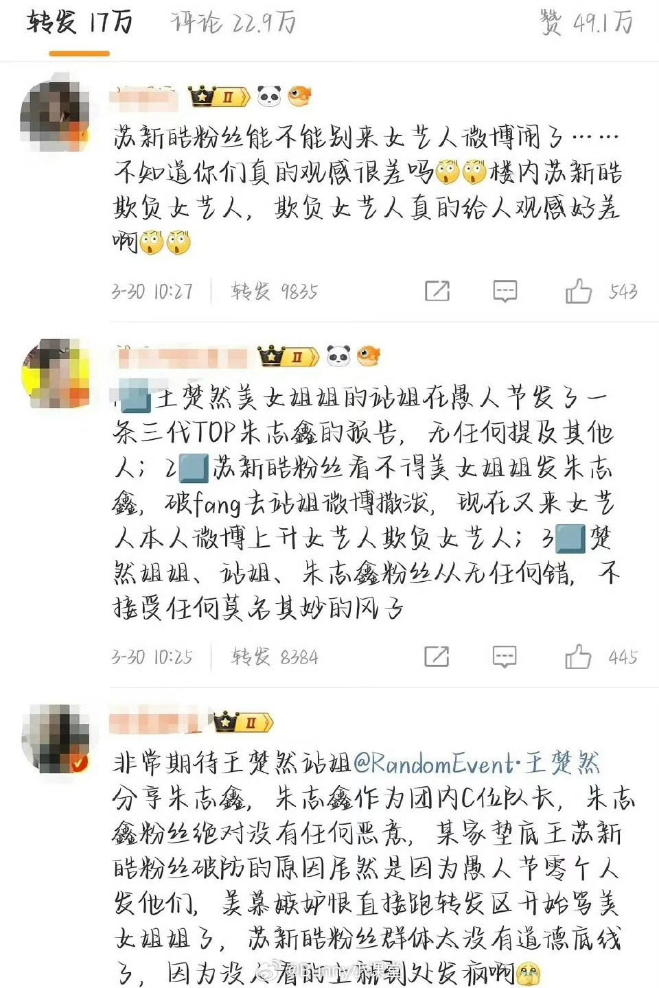王楚然站姐愚人节团建预告要发朱志鑫,说他热度稳居队内第一,单飞潜力巨大!同队的苏新皓粉丝不同意,说登陆少年的TOP只有苏新皓,还跑到了王楚然相关博文评论区……