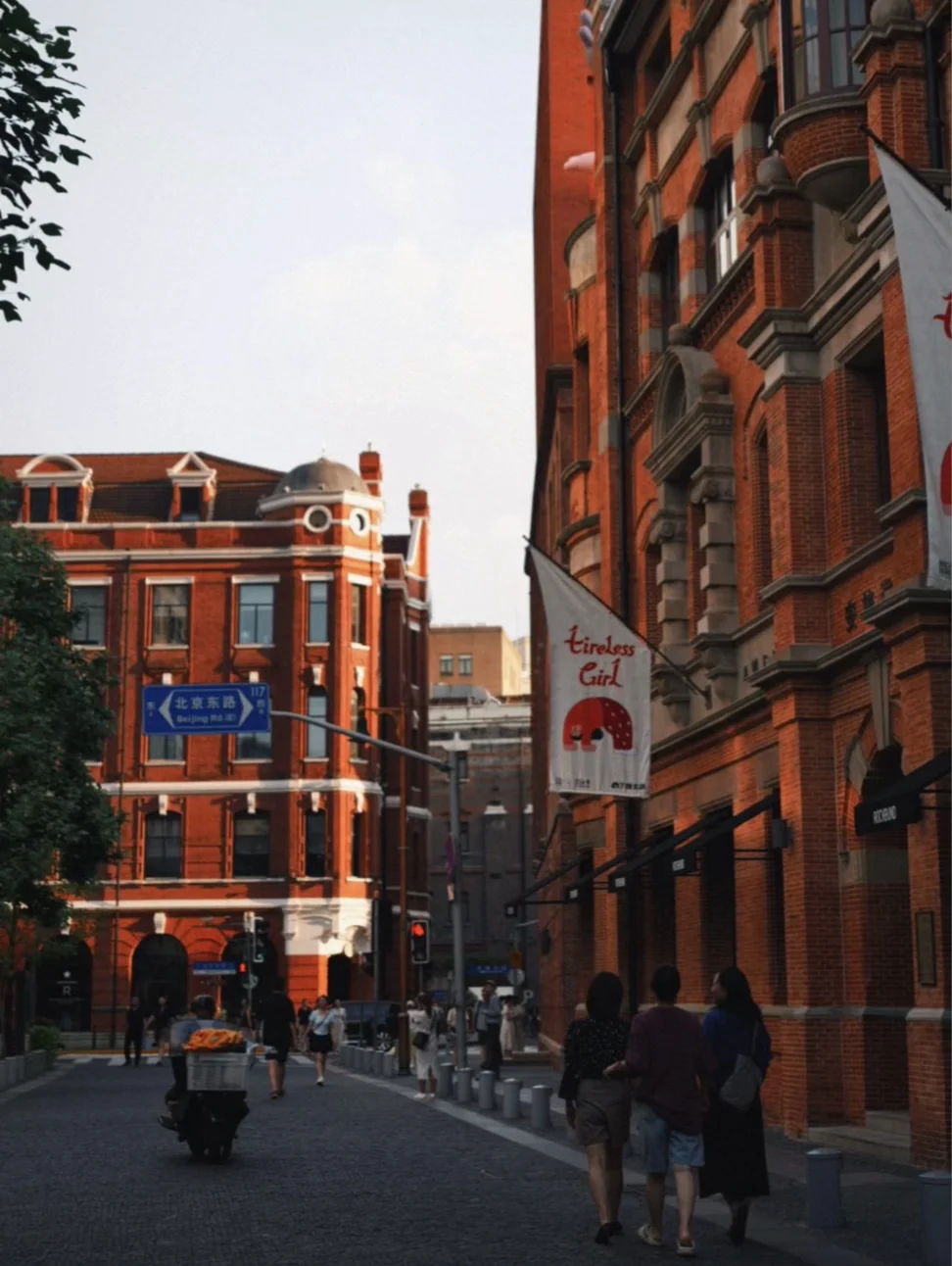 过桥便进入圆明园路,这里是 “外滩的背面” ,安静又高级。一排清水红砖的历史建筑里,藏着顶级画廊、设计书店和低调咖啡馆。适合慢慢走,感受上海“老钱”的审美底蕴。