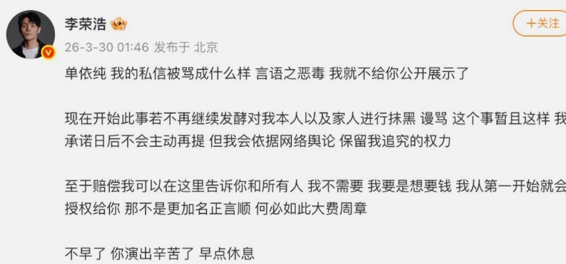 李荣浩:就不给授权,就不给你唱   单依纯:我偏要唱,你能拿我怎么滴?大不了赔5倍侵权费。   李荣浩:偏偏就不要钱,就不给你唱,把这事情捅出来,让全国人民知道你的恶劣行为。   有些人骨子里多低级啊。道歉了,还想咋地?不咋地,侵都侵了能咋地?   李荣浩的歌我听不来,但是原创的声音就应该被听见。这是有名气的,你说侵就侵。   那些幕后的创作者处境可想而知。有多少有才华的人熬不出头啊?