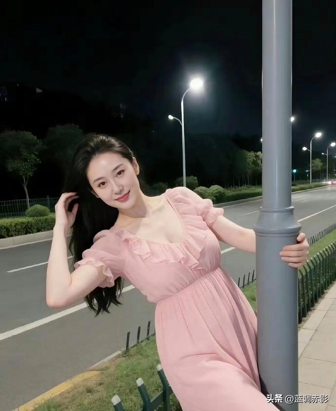 夜晚街头的温柔微笑,粉色裙摆随风飘扬。