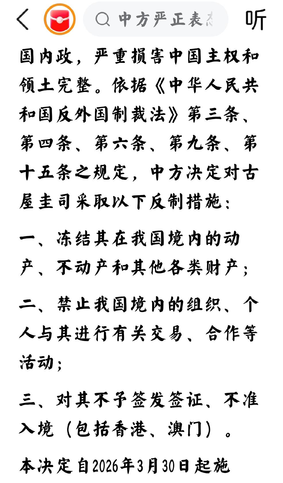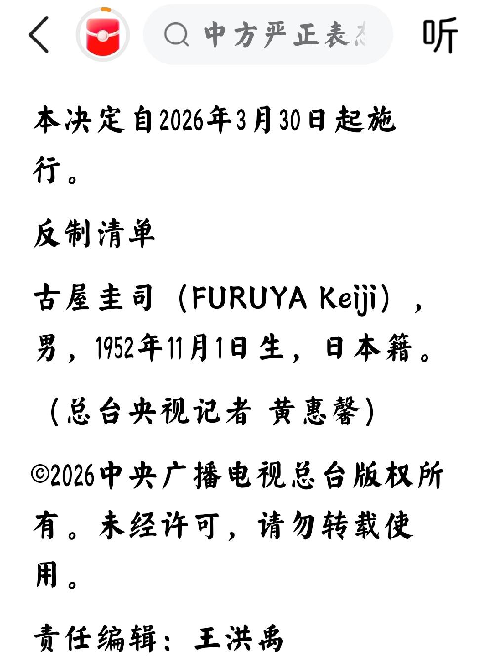 3月30日,央视新闻报道:“中方决定对日本国会众议员古屋圭司采取反制措施” 个人认为:这是中国在坚定不移的进行对日反制措施。 非常明确的表示,不但要在宏观经济政策方面进行反制,还要在微观个体方面进行重点对日反制。 我们中国人不屑于个人情绪化的疯狂挑衅。只会用实实在在的强而有力的措施进行实质性的消耗和压制。 个人非常期待日本新型军国主义分子在社交媒体进行疯狂挑拨,那样就会让全世界的舆论看到日本的真实面目。日媒不是宣称日本没有军国主义吗?那么只好用现实和事实说明。