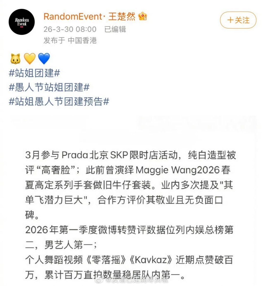 王楚然站姐愚人节团建预告要发朱志鑫,夸他单飞潜力巨大,数据稳居队内第一,引发苏新