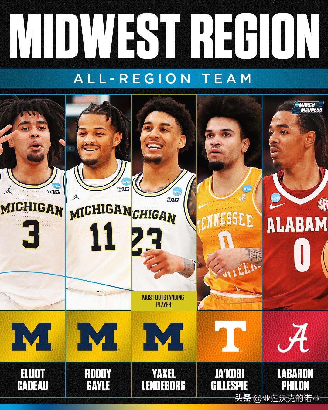 康涅狄格Tarris Reed荣获东区MOP,最佳阵容还有杜克Cameron Boozer与Cayden Boozer,Isaiah Evans,圣约翰大学Zuby Ejiofor,疯狂三月 密歇根大学Yaxel Lendeborg拿到中西区MOP,最佳阵容还有Roddy Gayle与Elliot Cadeau,田纳西Ja’Kobi Gillespie与阿拉巴马Labaron Philon。