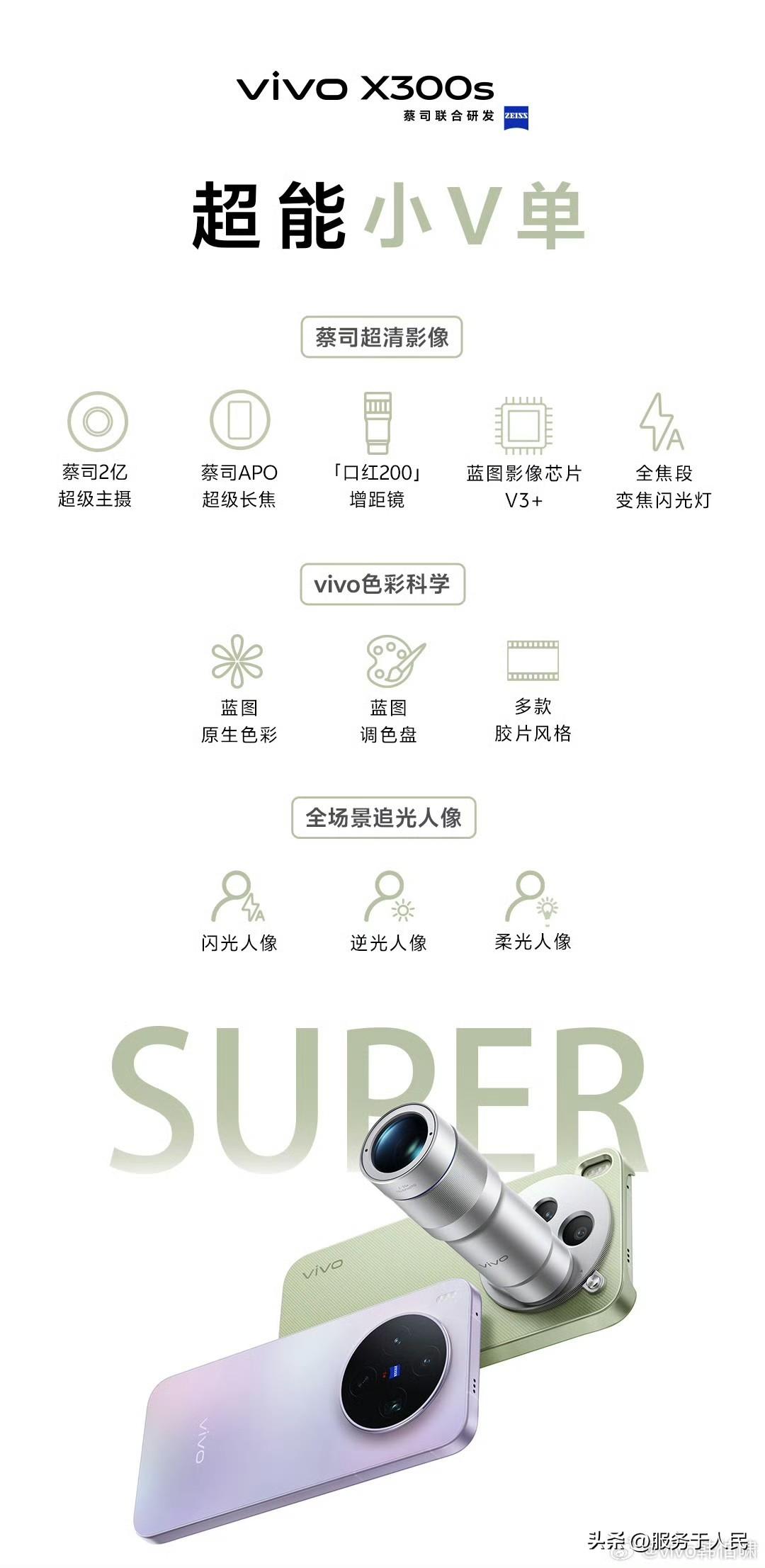 🔥vivo X300s,产品力绝对可以,就看最后怎么定价了,做好预期,4999起?从性能到影像到外围,几乎把能塞的配置都塞进去了! 性能上,天玑9500芯片搭配144Hz直屏,游戏体验拉满;影像上,蔡司2亿主摄+APO长焦+增距镜,配合V3+影像芯片,远摄和人像能力堪称“小V单”;续航上,7100mAh蓝海电池+90W有线+40W无线,续航能力有一定提升。外围配置也毫不含糊,对称双扬、超大马达、IP68/IP69防水,该有的都有了。 但问题的关键在于,这些顶级配置必然带来高昂的成本。怎么定价?起售价突破5000元,那它在性价比上就很难和一众机型抗衡,选择很多。其实,消费者对“S”系列的预期是“加量不加价”! 反之,如果vivo能以极具诚意的价格杀入市场,凭借影像和性能的双重优势,X300s必将成为年度爆款。 所以,价格才是唯一的悬念,你说呢?