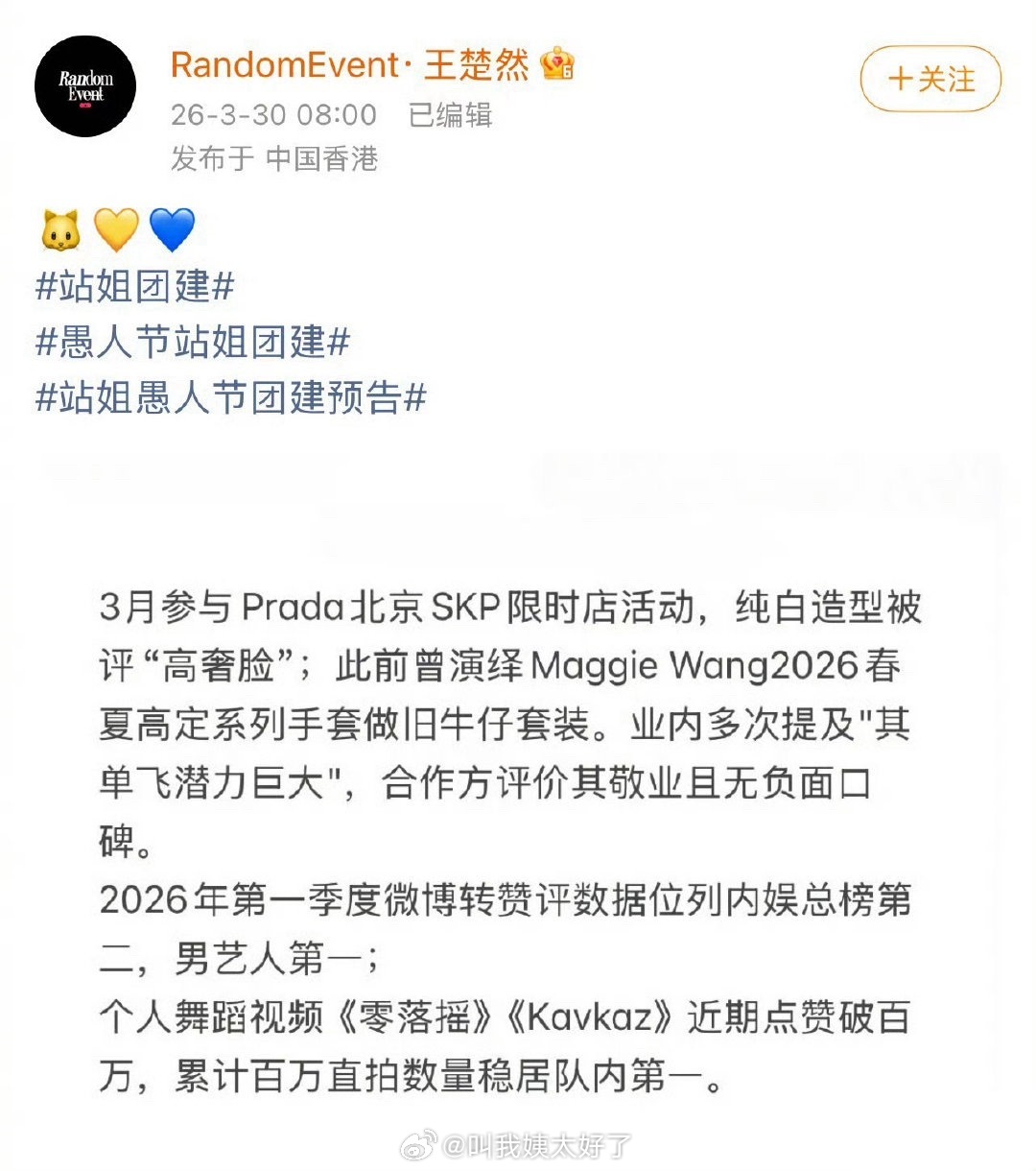 王楚然站姐愚人节预告发了朱志鑫,然后被苏新皓粉丝疯狂质疑,两家在王楚然的商务博下
