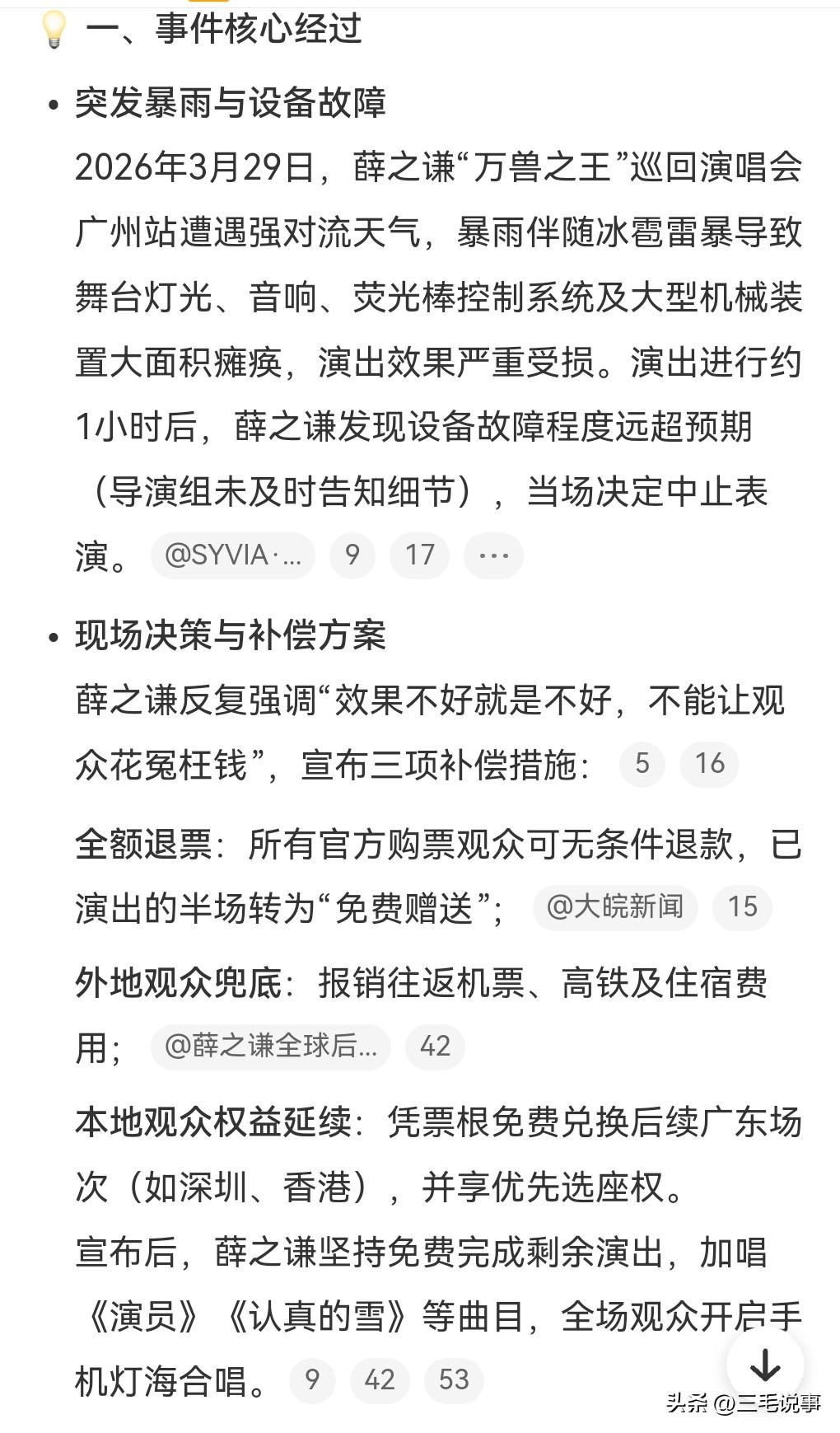 薛之谦也太会做人了吧,在娱乐圈混,要是没点口碑,那真的是很难混下去。 薛之谦的这个做法实在是太有口碑了。 薛之谦因下雨演唱会免费,这真的是太为观众着想了,这让观众很感动,那肯定会有更多的人愿意追随他。 对观众这么真诚,但是也有质疑的声音说这会不会太惯着观众了。 但是从长远的角度来看的话,薛之谦的做法肯定会让更多的人佩服,也是有利于事业发展的。