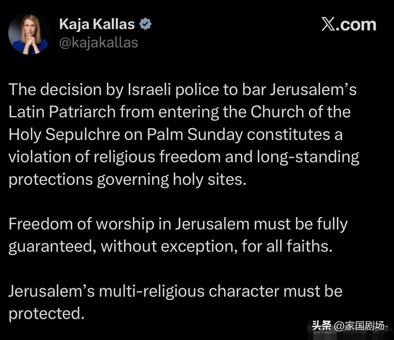 欧盟外交政策负责人卡娅·卡拉斯谴责以色列,禁止耶路撒冷拉丁宗主教在棕枝主日进入圣墓教堂的决定,称此举侵犯了宗教自由和对圣地的长期保护。