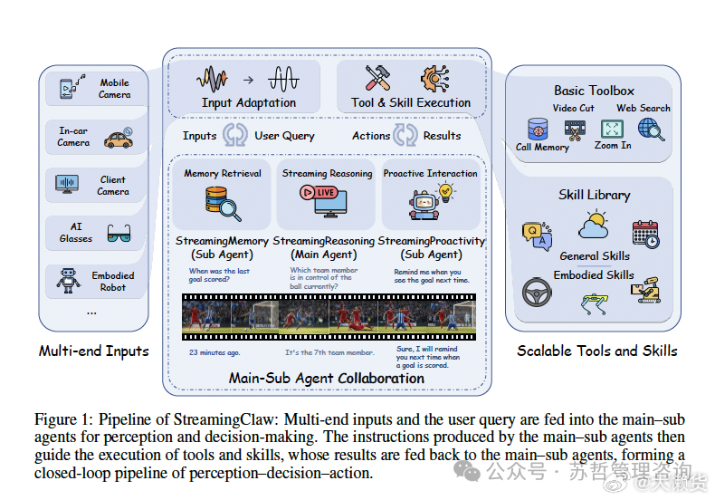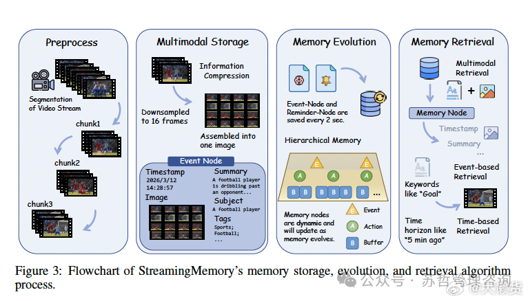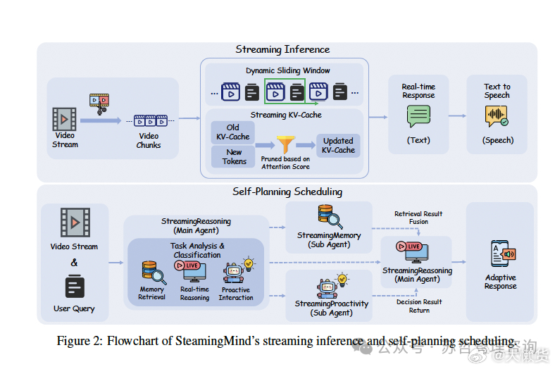 主智能体管流式推理调度,两个子智能体分别扛长时记忆和主动交互,动态滑窗+KV缓存剪枝,低延迟跑长视频也不在话下。