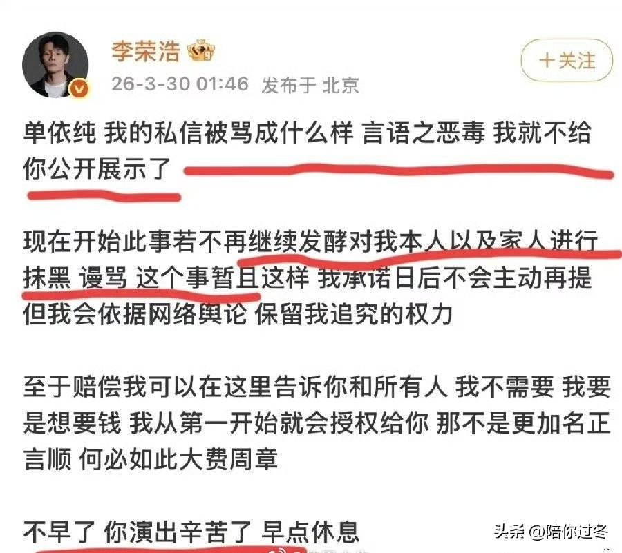李荣浩格局真大!不需要赔偿! 这两天因为《李白》翻唱版权问题,两人闹得沸沸扬扬,双方粉丝也疯狂带节奏,主打一个看热闹不嫌事大,导致李荣浩凌晨1点多还在发微博对线。[捂脸] 其实单依纯翻唱没授权这事本来就理亏,结果现在还闹到李荣浩私信被骂到不堪入目,家人也被网暴,真是哑巴吃黄连有苦说不出呀! 还好单依纯本人还是比较明事理的,第一时间站出来诚恳道歉了,所有的错误都在自己与他人无关,并愿意承担所有赔偿费用。 而李荣浩也非常大度,说道不需要任何赔偿,如果是为了钱的话,当初就完全可以授权给你了,并重点说到,如果以后家人与自己不再遭受网暴此事也就到此为止,算是翻篇了。 这个结局还是不错的,算是体面收场了,双方毕竟不想闹得太难看,同一个圈子的抬头不见低头见,事情解决就行了,没必要把对方逼到绝路上。