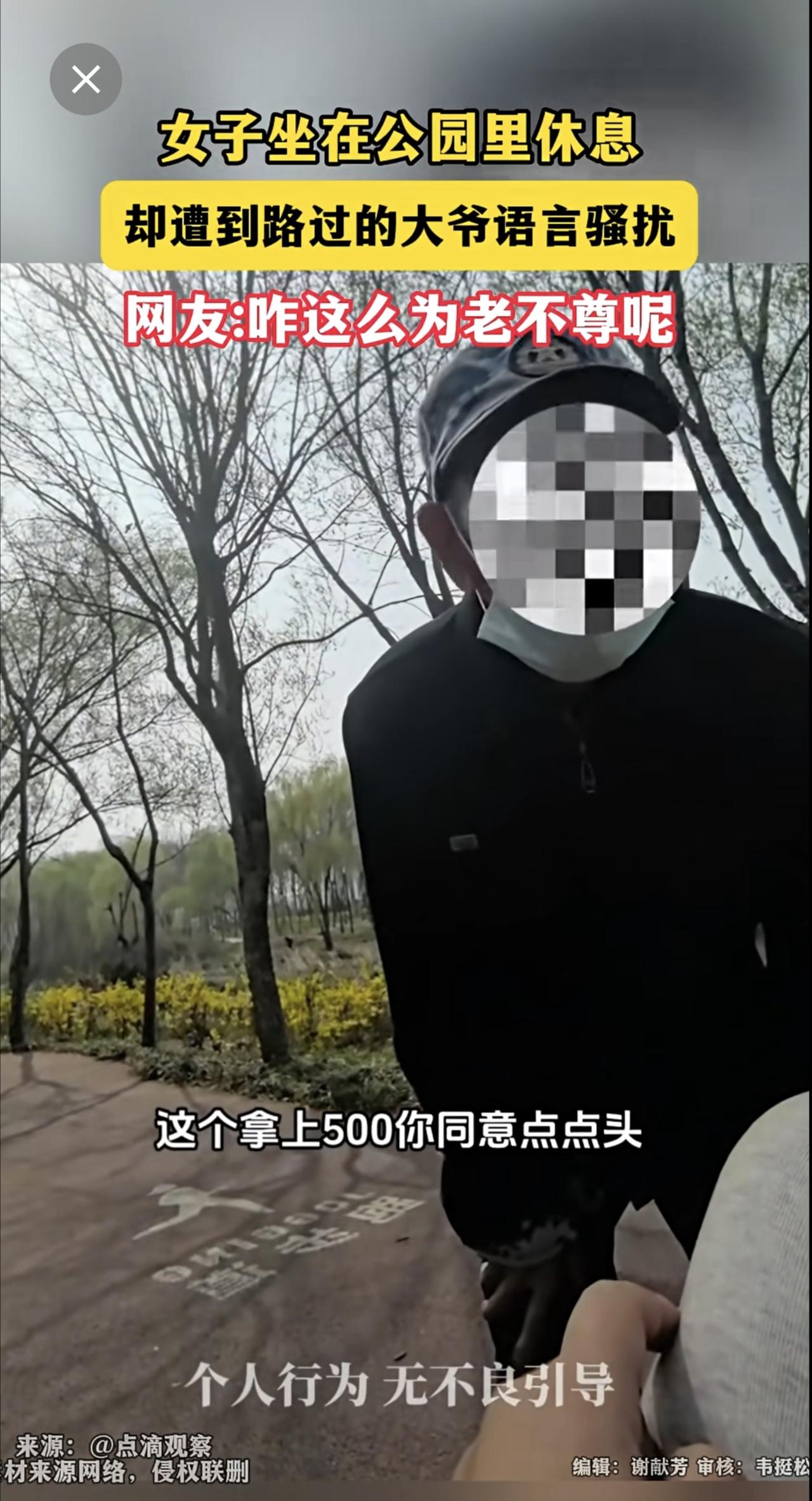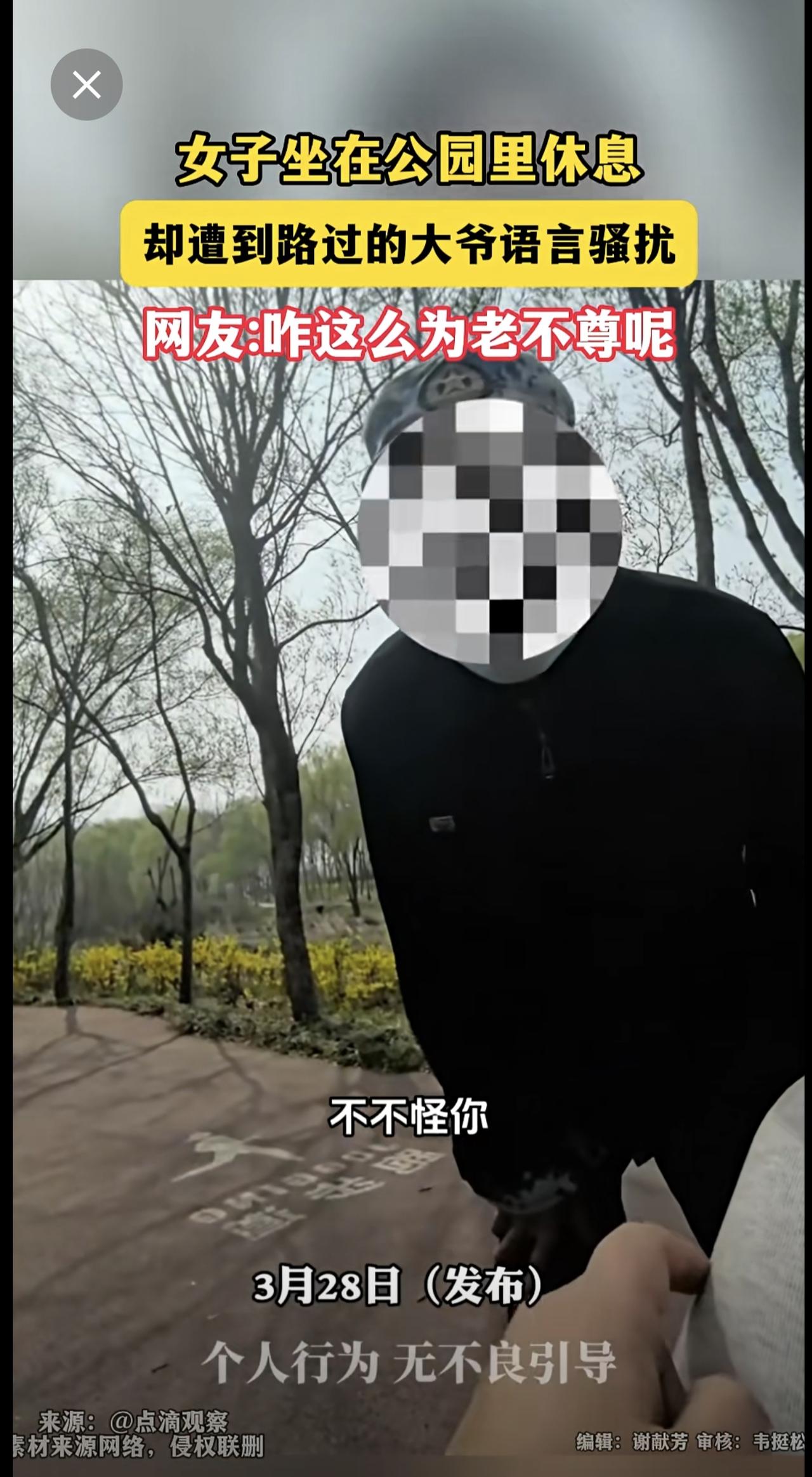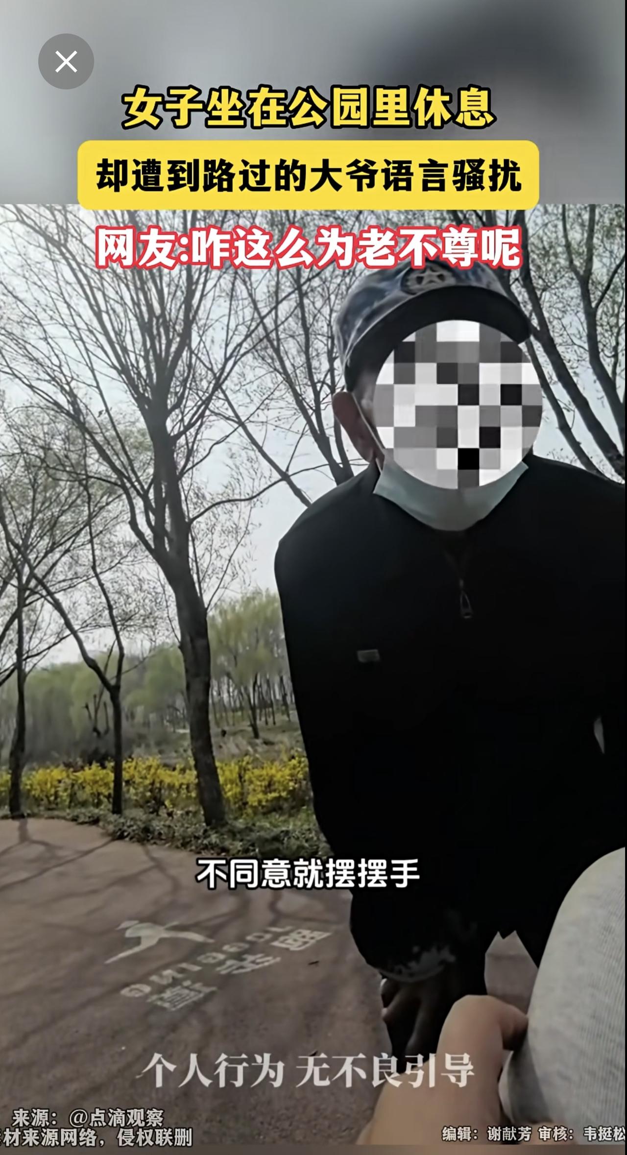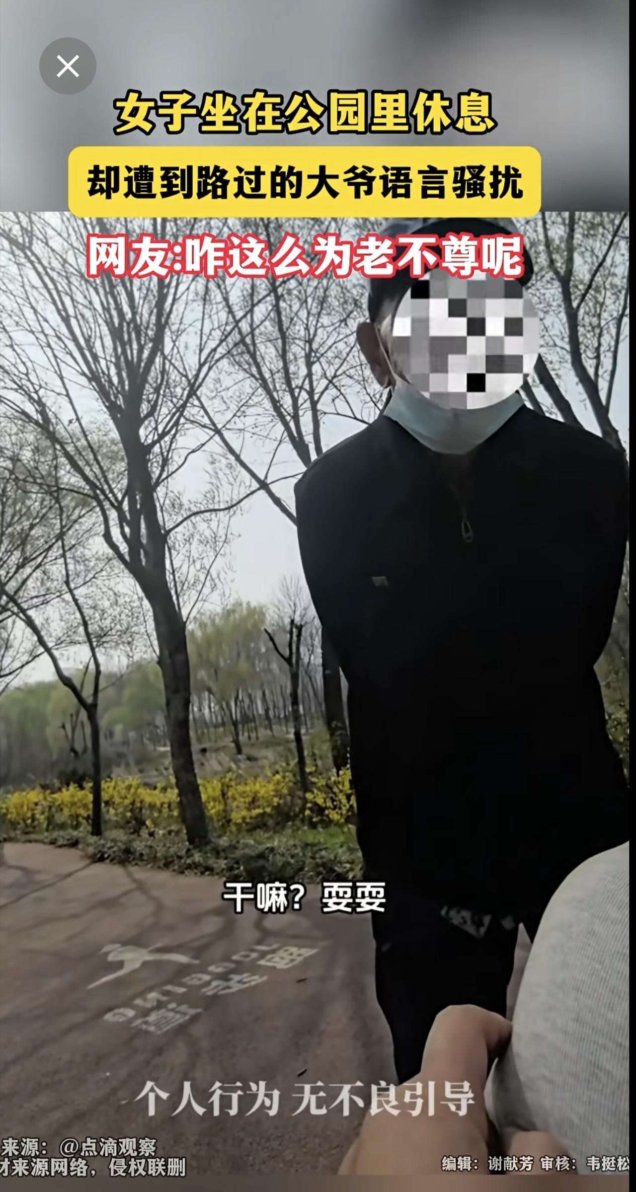 女子坐在公园里休息,却遭到路过的大爷语言骚扰 网友:咋这么为老不尊呢?