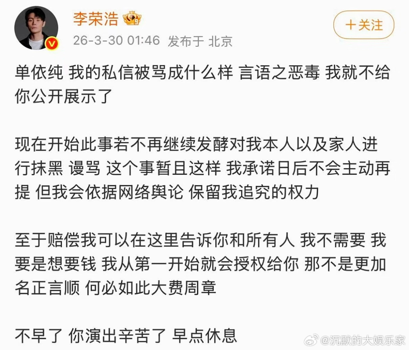 对此,李荣浩表示自己并不需要赔偿,如果想要钱一开始就会授权,何必如此大费周章。最后叮嘱单依纯“你演出辛苦了,早点休息。”