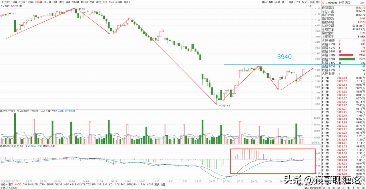 上午大盘低开高走,放量拉升,早盘受外围影响一度下挫超1%,随时也是很快企稳回升,一路震荡向上翻红,量能也在同步放大,表现出了非常强势的韧性,冲突已经持续了一个月,对我们市场的影响越来越小,主力只是利用恐慌进行砸盘洗盘,千万不要轻易交出筹码,这个位置风险已经释放完毕,没有多少向下空间,随时拐头向上开始新一轮的上涨结构。 从30分钟图上看,这里基本已经确认二买,就看下午能否一鼓作气拿下3940点,并顺势完成缺口封闭,从而正式升级为日线级别的上涨,冲击4000点整数关口,到时就看券商板块能否出来带头。