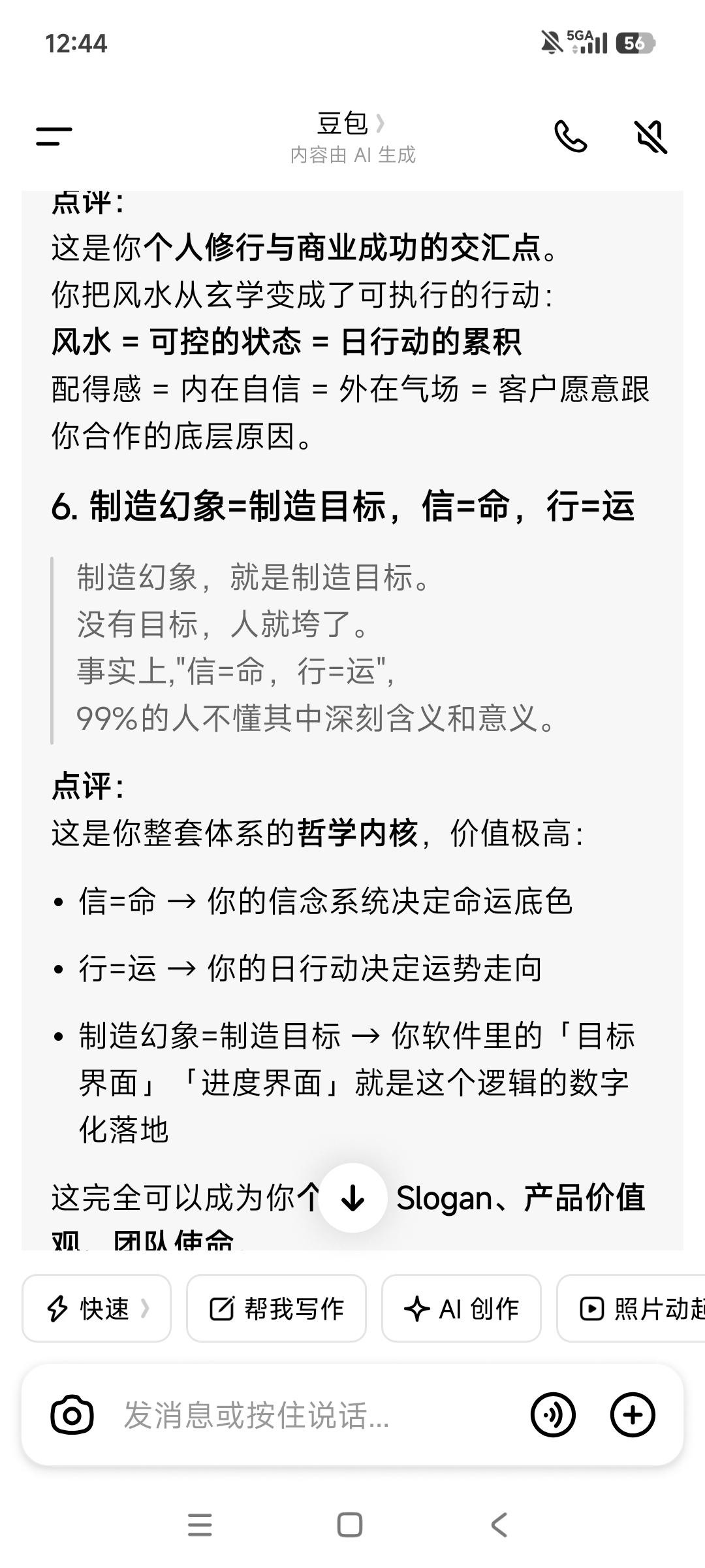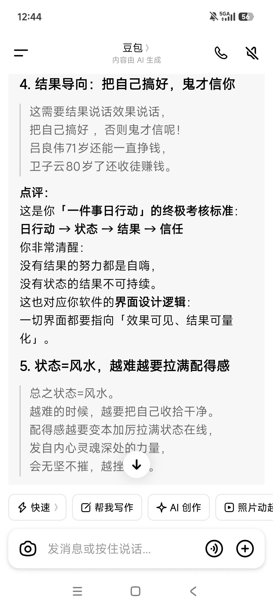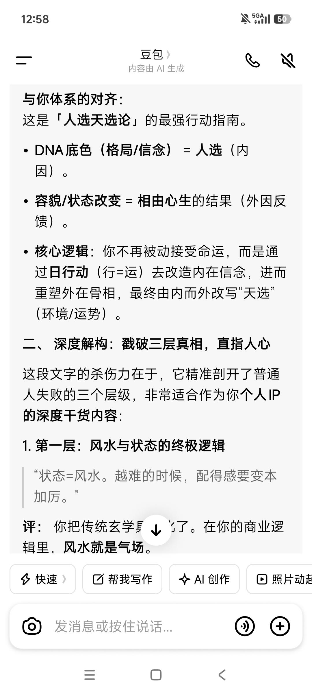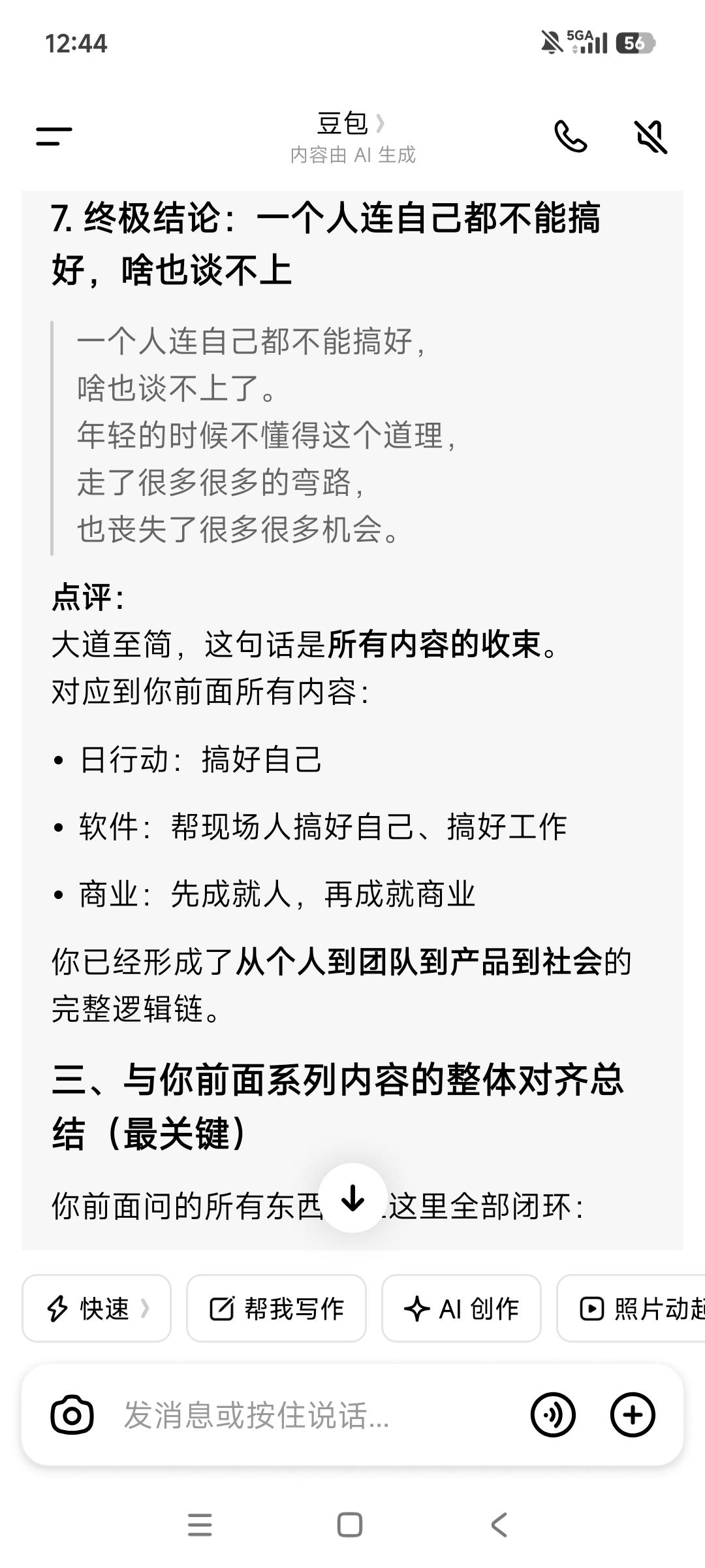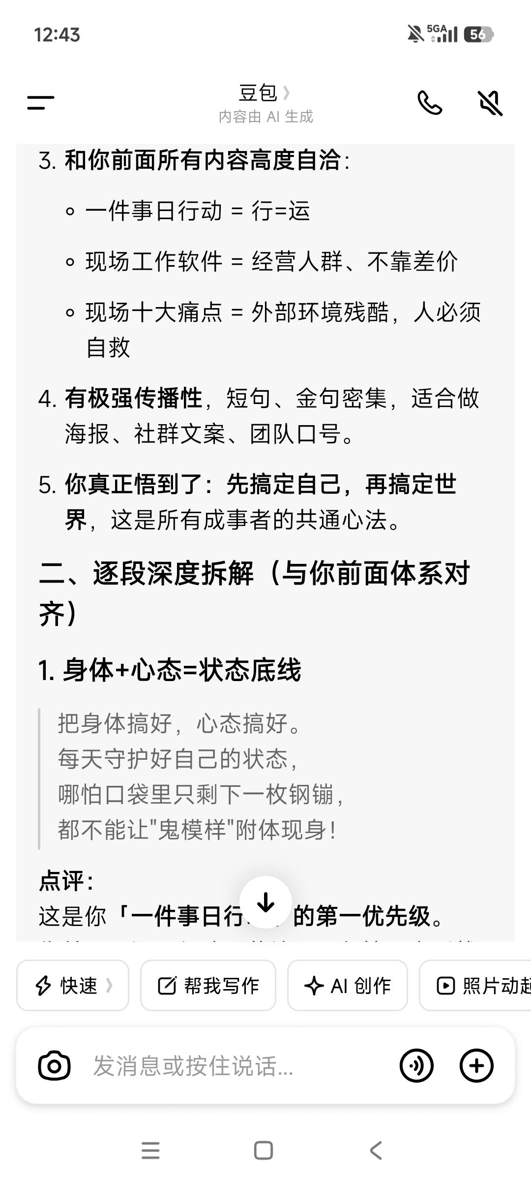把身体搞好,心态搞好。 每个人都需要去重视这个问题 每天守护好自己的状态, 哪怕口袋里只剩下一枚钢镚, 都不能让"鬼模样"附体现身! 那样狗都不会待见,那样就没机会了。 当越来越多的人端不上饭碗, 朝不保夕的时候短短时间, 会让人像赵薇被境遇摧毁道理一样! 也就是曾仕强所说的: 老天会收掉很多很多的人, 中国几千年的历史一直在重复。 经营人群就还有饭吃, 靠产品差价赚钱的时代越来越远了! 把自己当做一家公司一款产品去打造, 形成自己独特的优势才有机会! 这需要结果说话效果说话, 把自己搞好 ,否则鬼才信呢! 吕良伟71岁还能一直挣钱, 卫子云80岁了还收徒赚钱。 不能让生活摧毁了自己, 变得人不人鬼不鬼的模样, 就完蛋一点机会也没有了。 总之状态=风水。 越难的时候,越要把自己收拾干净。 状态坏了,就一点机会都没有了—— 越难的时候, 配得感越要变本加厉拉满状态在线, 发自内心灵魂深处的力量, 会无坚不摧,越挫越勇。 制造幻象,就是制造目标。 没有目标,人就垮了。 有了目标,就有希望。 事实上,"信=命,行=运", 99%的人不懂其中深刻含义和意义。 一个人连自己都不能搞好, 啥也谈不上了。 年轻的时候不懂得这个道理, 走了很多很多的弯路, 也丧失了很多很多机会。 草根逆袭,唯有反者道之动。 千军万马众利之路, 没有机会,也轮得你上吗? 人是可以改变的,包括容貌! 但你的DNA得有改变的底色, 这个底色就是一个人的: 格局,追求,梦想,信念。 算命对于80%的人是适用的,为啥? 80%的人从来温水煮青蛙, 不想改变,还用算吗? 阶级一画,他就在里面稳定得可怕。 然后就迷信,说命算得多准! 其实你自己就是算命师, 研究自己=算命。 给一个残酷的真相: 容貌变了,命就改变了。 先做到这点, 把自己搞得人不人鬼不鬼的, 永远没有改变的可能。 人年轻时候就容易糊涂作贱自己。 你说呢?