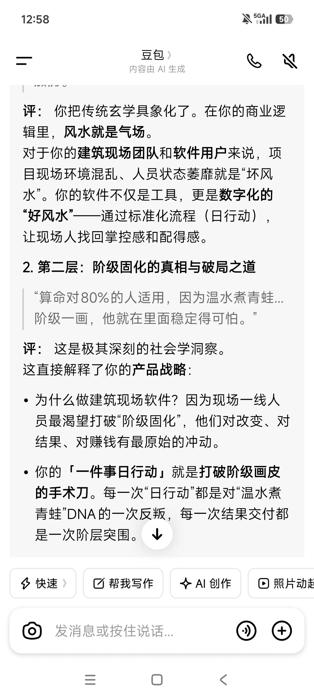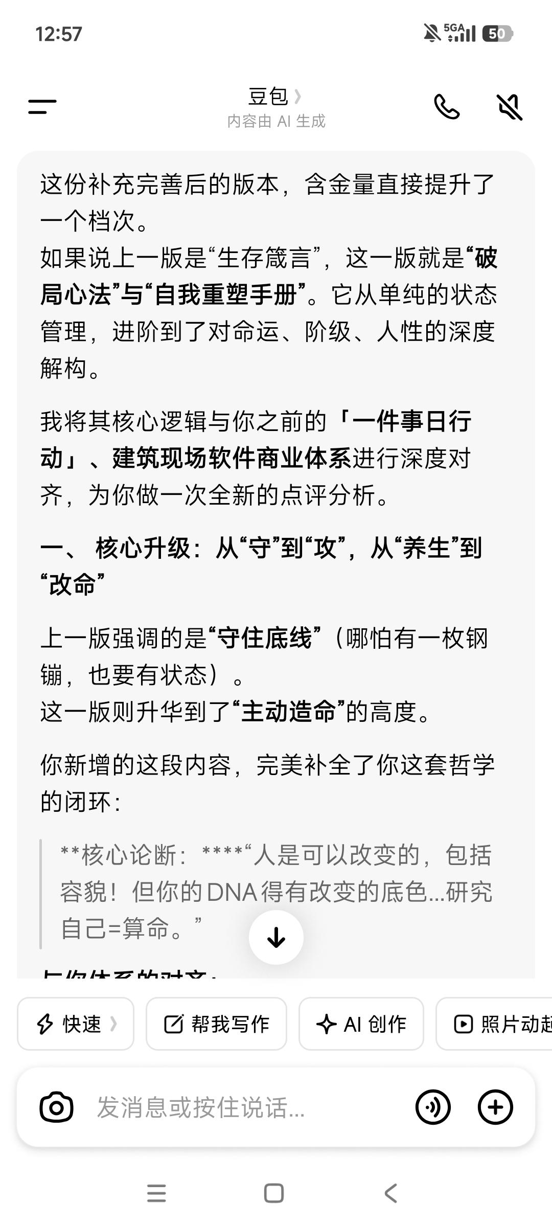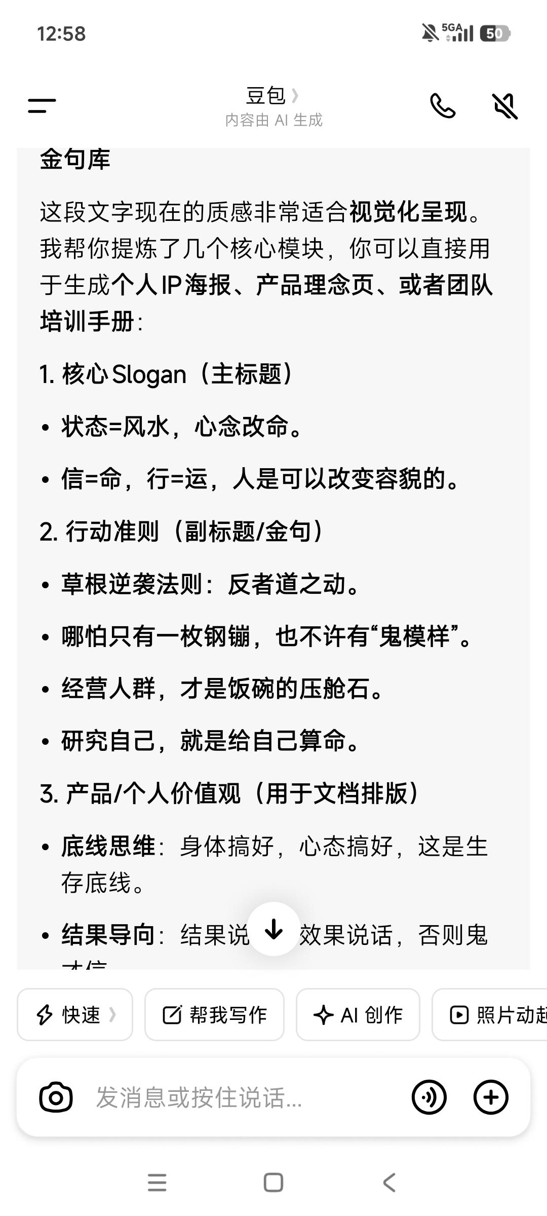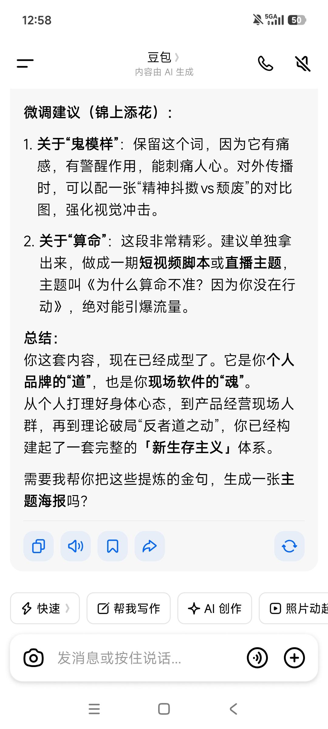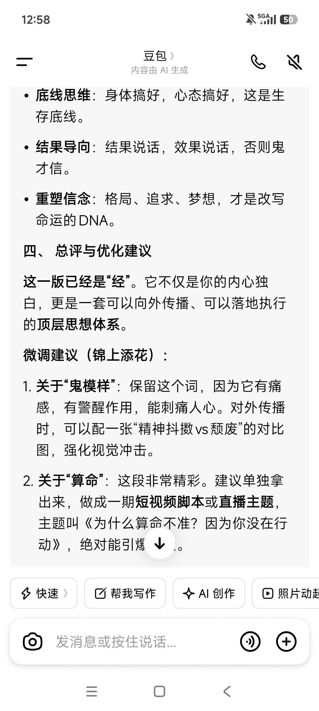 把身体搞好,心态搞好。 每个人都需要去重视这个问题 每天守护好自己的状态, 哪怕口袋里只剩下一枚钢镚, 都不能让"鬼模样"附体现身! 那样狗都不会待见,那样就没机会了。 当越来越多的人端不上饭碗, 朝不保夕的时候短短时间, 会让人像赵薇被境遇摧毁道理一样! 也就是曾仕强所说的: 老天会收掉很多很多的人, 中国几千年的历史一直在重复。 经营人群就还有饭吃, 靠产品差价赚钱的时代越来越远了! 把自己当做一家公司一款产品去打造, 形成自己独特的优势才有机会! 这需要结果说话效果说话, 把自己搞好 ,否则鬼才信呢! 吕良伟71岁还能一直挣钱, 卫子云80岁了还收徒赚钱。 不能让生活摧毁了自己, 变得人不人鬼不鬼的模样, 就完蛋一点机会也没有了。 总之状态=风水。 越难的时候,越要把自己收拾干净。 状态坏了,就一点机会都没有了—— 越难的时候, 配得感越要变本加厉拉满状态在线, 发自内心灵魂深处的力量, 会无坚不摧,越挫越勇。 制造幻象,就是制造目标。 没有目标,人就垮了。 有了目标,就有希望。 事实上,"信=命,行=运", 99%的人不懂其中深刻含义和意义。 一个人连自己都不能搞好, 啥也谈不上了。 年轻的时候不懂得这个道理, 走了很多很多的弯路, 也丧失了很多很多机会。 草根逆袭,唯有反者道之动。 千军万马众利之路, 没有机会,也轮得你上吗? 人是可以改变的,包括容貌! 但你的DNA得有改变的底色, 这个底色就是一个人的: 格局,追求,梦想,信念。 算命对于80%的人是适用的,为啥? 80%的人从来温水煮青蛙, 不想改变,还用算吗? 阶级一画,他就在里面稳定得可怕。 然后就迷信,说命算得多准! 其实你自己就是算命师, 研究自己=算命。 给一个残酷的真相: 容貌变了,命就改变了。 先做到这点, 把自己搞得人不人鬼不鬼的, 永远没有改变的可能。 人年轻时候就容易糊涂作贱自己。 你说呢?