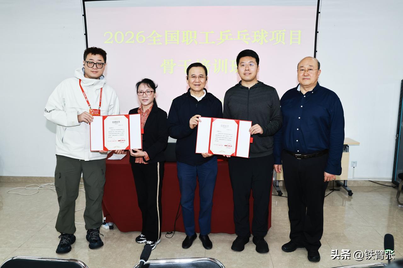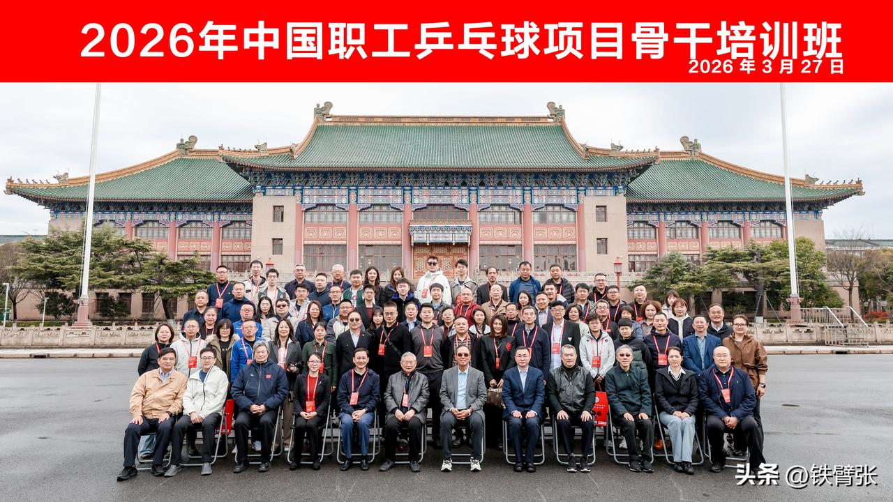 由中国职工文化体育协会主办,上海体育大学中国乒乓球学院、中国职工文化体育协会乒乓球专业委员会承办的2026 全国职工乒乓球项目骨干培训班于2026年3月27日至29日在上海乒乓球学院成功举办。 图1:2026 全国职工乒乓球项目骨干培训班开班仪式现场 图2:88岁高龄的国家体委原副主任、第五任国际乒联主席、国际乒联终身名誉主席徐寅生讲话 图3:国家体育总局原副局长、全国总工会原副主席蔡振华讲话 图4:中国职工文化体育协会会长李守镇讲话并全程参加培训班,与学员们广泛交流如何推广提升职工乒乓球运动水平 图5:李守镇会长和蔡振华主席亲切交流 图6:国家体育总局乒羽中心原主任刘凤岩出席开班仪式并讲授《职工体育竞赛及管理》 图7:国家乒乓球队原领队、国际乒联技术委员会主席姚振绪讲授《中国乒乓球运动的发展》 图8:上海体育大学党委书记李崟在开班仪式上致辞 图9:上海体育大学中国乒乓球学院院长、国家乒乓球队原女队主教练、国际乒联原副主席施之浩讲授《乒乓人才培养》 图10:上海体育大学教授、乒乓球国际裁判长、中国乒协裁委会副主任孙麒麟讲授《乒乓球裁判员专业素养与职业道德行为规范》 图11:中国职工文化体育协会乒乓球专业委员会主任孙勃讲话 图12:中央电视台原乒乓球节目主持人蔡猛讲授《新媒体与乒乓球赛事的宣传和策划》 图13:上海体育大学中国乒乓球学院副院长任杰讲授《人工智能+乒乓球》 图14:学员们在上海乒乓球学院感受新式乒乓球发球机及鹰眼在训练及比赛中的运用 图15:中国职工文化体育协会会长李守镇、副会长李艳清、中国职工文化体育协会乒乓球专业委员会主任孙勃为学员代表颁发培训班结业证书 图16:出席开班仪式的领导和嘉宾合影 图17:领导和全体学员合影 图18:培训期间举办了学员乒乓球比赛