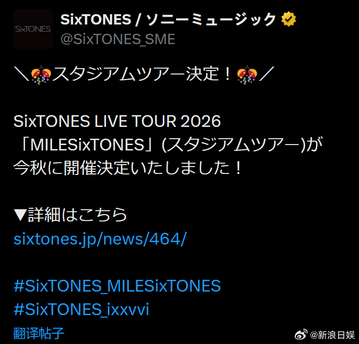 SixTONES 将举办其首个stadium巡演“SixTONES LIVE TOUR 2026「MILESixTONES」”。