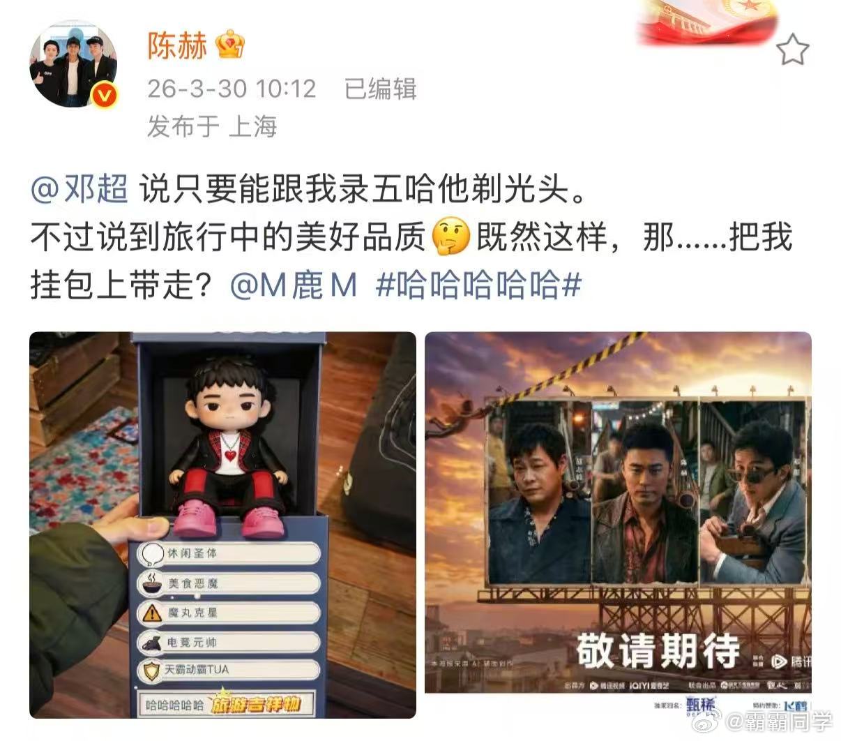 陈赫让鹿晗把他挂包上带走陈赫五哈团旅游吉祥物哈哈哈哈哈 自带烟火气和幽默感成为团队吉祥物,出行避雷唠戏调节情绪样样行,佛系慵懒爱享受生活,这种反差感反而让旅途看点变得更多