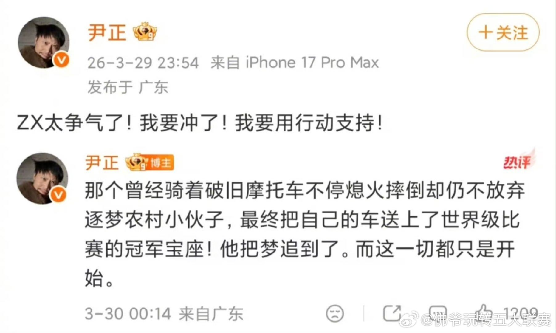 国潮崛起引发共鸣张雪机车夺冠的消息传出后,迅速引发各界关注。酷爱机车文化的演员尹正第一时间连续发文,先是激动表示“ZX太争气了!我要冲了!我要用行动支持!”,随后又深情讲述张雪的追梦故事,为中国品牌呐喊助威。尹正说要用行动支持张雪 话题迅速登上热搜,阅读量突破250万。网友们纷纷留言:“这才是真正的国潮骄傲!”“从草根到世界冠军,太燃了!”“必须支持中国造,这才是我们该追的星”,不少人表示要像尹正一样,用实际行动支持国产摩托车品牌。