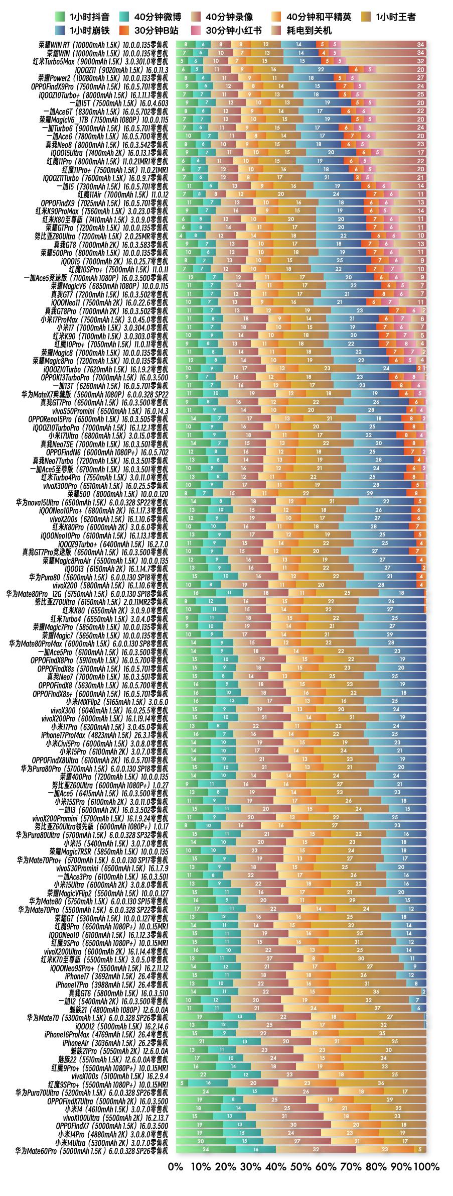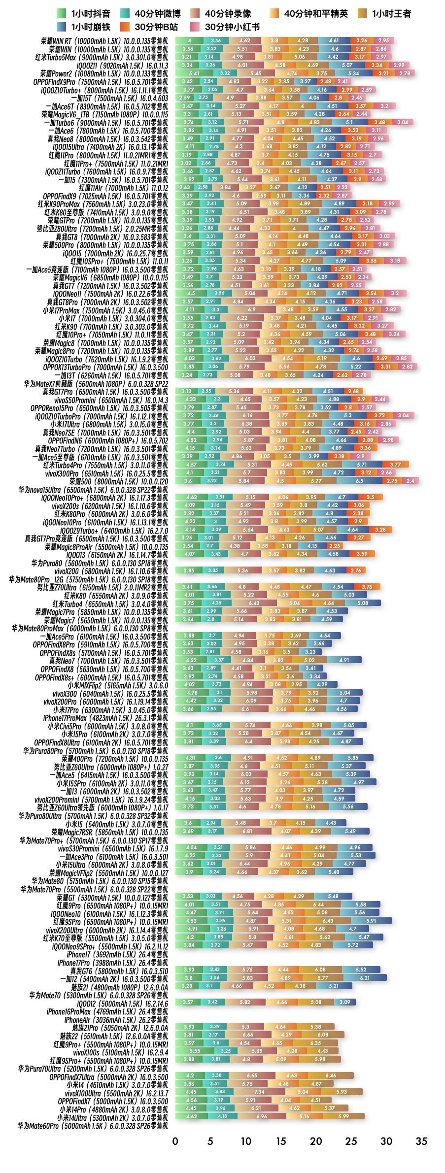 『3月30日最新手机续航榜单』 新评科技续航排行榜 6.0标准续航排行榜新增5台手机续航成绩,复测28台手机续航成绩;6.0折叠屏版续航排行榜新增2台手机续航成绩,复测5台手机续航成绩。 ⭐️完整详细榜单请访问新评科技数据库小程序⭐️ 『6.0标准续航榜单』新增 ① iQOOZ11 16.0.11.3版本总续航时间7小时59分钟,最新排名第4名 ② 荣耀MagicV6_1TB 全折叠状态下 10.0.0.115版本总续航时间7小时21分钟,最新排名第10名 ③ 荣耀MagicV6 全折叠状态下 10.0.0.115版本总续航时间6小时17分钟,最新排名第30名 ④ 华为MateX7典藏版 全折叠状态下 6.0.0.328 SP22版本总续航时间5小时55分钟,最新排名并列第43名(王者荣耀高清+120不符合测试标准) ⑤ OPPOFindN6 全折叠状态下 16.0.5.702版本总续航时间5小时43分钟,最新排名并列第50名 『6.0标准续航榜单』复测 ① iQOOZ10Turbo+零售机 第6次复测 16.1.11.1版本续航时间增加29分钟,总续航时间7小时46分钟,最新排名第7名【对比历史成绩续航不变】 ② 一加Ace6T零售机 第5次复测 16.0.5.702版本续航时间增加5分钟,总续航时间7小时23分钟,最新排名第9名【对比历史成绩续航缩短】 ③ 一加Turbo6零售机 第3次复测 16.0.5.701版本续航时间缩短4分钟,总续航时间7小时17分钟,最新排名第11名【对比历史成绩续航缩短】 ④ 一加Ace6零售机 第6次复测 16.0.5.700版本续航时间缩短12分钟,总续航时间7小时15分钟,最新排名第12名【对比历史成绩续航缩短】 ⑤ 真我Neo8零售机 第3次复测 16.0.3.542版本续航时间缩短16分钟,总续航时间7小时11分钟,最新排名第13名【对比历史成绩续航缩短】 ⑥ iQOO15Ultra零售机 第5次复测 16.0.13.1版本续航时间缩短9分钟。总续航时间7小时10分钟,最新排名第14名【对比历史成绩续航不变】 ⑦ 努比亚Z80Ultra零售机 第6次复测 2.0.25MR版本续航时间缩短5分钟,总续航时间6小时30分钟,最新排名第24名【对比历史成绩续航缩短】 ⑧ 荣耀500Pro零售机 第6次复测 10.0.0.135版本续航时间缩短9分钟,总续航时间6小时26分钟,最新排名第26名【对比历史成绩续航缩短】 ⑨ iQOONeo11零售机 第6次复测 16.0.22.6版本续航时间缩短1分钟,总续航时间6小时13分钟,最新排名并列第32名【对比历史成绩续航缩短】 10 小米17零售机 第7次复测 3.0.304.0版本续航时间增加7分钟,总续航时间6小时11分钟,最新排名第35名【对比历史成绩续航不变】 11 红米K90零售机 第5次复测 3.0.303.0版本续航时间缩短17分钟,总续航时间6小时10分钟,最新排名第36名【对比历史成绩续航缩短】 12 iQOONeo10Pro+零售机 第5次复测 16.1.17.3版本续航时间缩短10分钟,总续航时间5小时30分钟,最新排名并列第56 名【对比历史成绩续航缩短】 13 华为nova15Ultra零售机 第4次复测 6.0.0.328 SP22版本续航时间缩短16分钟,总续航时间5小时30分钟,最新排名并列第56名【对比历史成绩续航缩短】 14 vivoX200s零售机 第5次复测 16.1.10.6版本续航时间增加4分钟,总续航时间5小时30分钟,最新排名并列第56名【对比历史成绩续航不变】 15 iQOO13零售机 第5次复测 16.1.14.7版本续航时间缩短6分钟,总续航时间5小时16分钟,最新排名并列第64名【对比历史成绩续航不变】 16 vivoX200零售机 第5次复测 16.1.10.6版本续航时间增加18分钟,总续航时间5小时16分钟,最新排名并列第64名【对比历史成绩续航不变】 17 OPPOFindX8s零售机 第3次复测 16.0.5.701版本续航时间缩短14分钟,总续航时间4小时55分钟,最新排名并列第76名【对比历史成绩续航缩短】 18 vivoX300零售机 第3次复测 16.0.25.5版本续航时间增加4分钟,总续航时间4小时49分钟,最新排名并列第81名【对比历史成绩续航缩短】 19 vivoX200Pro零售机 第4次复测 16.1.19.14版本续航时间缩短26分钟,总续航时间4小时49分钟,最新排名并列第81名【对比历史成绩续航缩短】