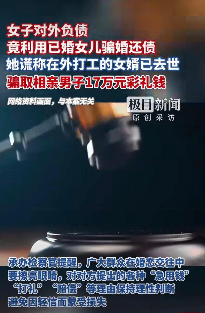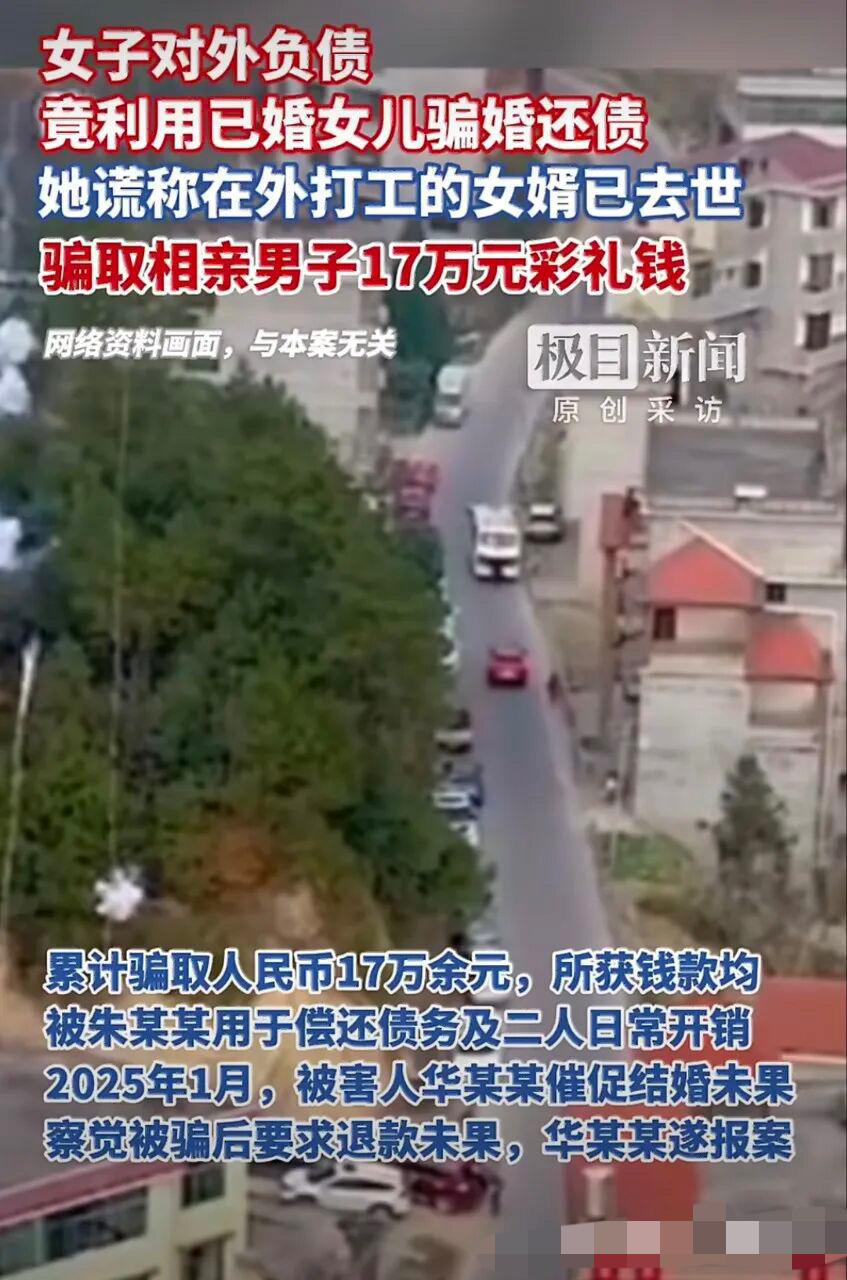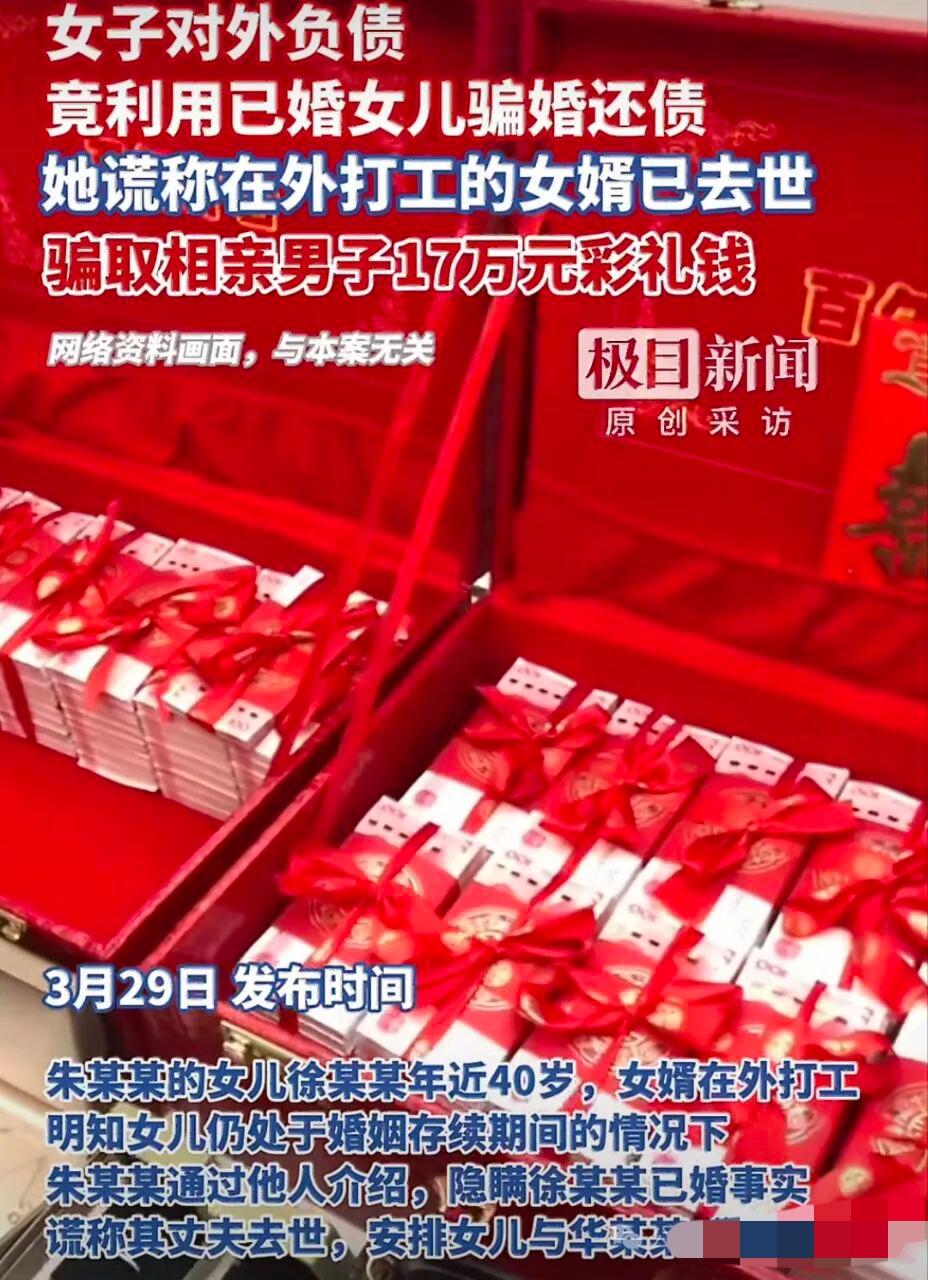 妈妈带着已婚的女儿骗婚,骗取一男子 17 万彩礼,所得钱款挥霍一空。事发湖北咸宁通山,朱某因为经营不善在外欠了巨债,看到老家很多大龄女子结婚都可以拿到高额彩礼,就想起了自己的女儿徐某,女儿虽然年近 40,早已结婚,但是老公常年在外打工,很少回家。 朱某心生一计,找到了当地一个媒人谎称女婿在外面死了,女儿想找个人家嫁了,媒人多方物色,很快就找到了一个想找女人结婚的男子张某。 张某见了许某后非常满意,初步定下两人结婚的意向。于是张某准备了十多万的现金彩礼,还有金银首饰等。在后续的交往中,张某多次转账。朱某甚至编造生病等理由找张某要钱,张某都一一应允。经过半年多的了解,张某认为时机已到,可以领证结婚了,向朱某提出这个要求,朱某担心事情败露,朱某拉拉黑了张某。 张某预感被骗,选择报警。经过调查发现徐某已婚,其老公在外打工。对于朱某和徐某合伙骗骗婚的事实,朱某被法院判处三年半,徐某被判处一年九个月。这对丧良心的母女,实属罪有应得。
