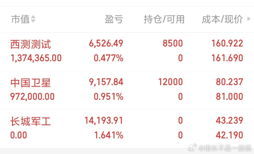 今日实盘日记分享介入 $西测测试(SZ301306)$ $中国卫星(SH600118)$ 卖出 $长城军工(SH601606)$ 支持我的朋友点赞👍打888,个人记录,请勿盲目跟风,盈亏自负!A股分享