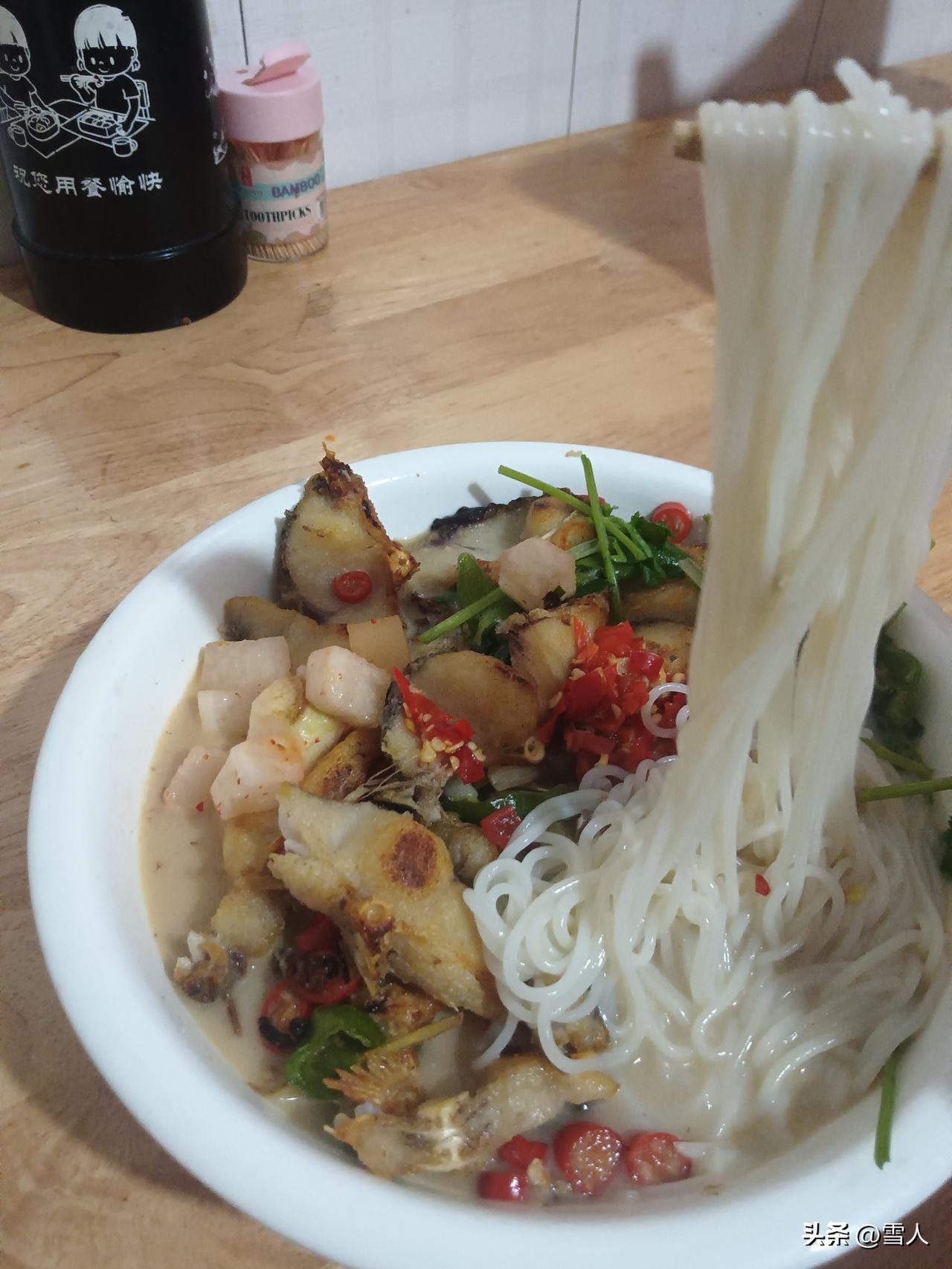 另一边烧水泡米粉,米粉煮熟捞入碗中,浇上浓郁的红烧鱼汤,铺上几块鱼肉,一碗热气腾腾的鱼粉便成了。鲜美的鱼汤渗入米粉,鱼肉紧实不腥,吃起来又解馋又解酒。